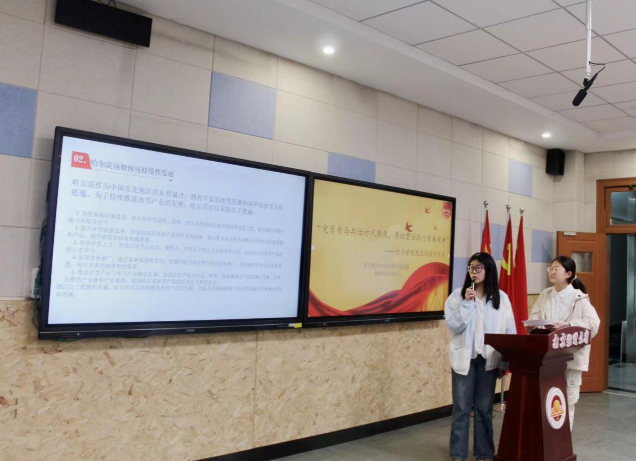第四小组把目光聚焦于哈尔滨冰雪文化爆火的新闻热点。哈尔滨推动冰雪文化与旅游深度融合,把“白雪”变“白银”,让中国大地的“冰雪资源”唤来经济发展的“新春天”。李俊辉同学面对评委们的提问回答道:“哈尔滨冰雪产业的爆火启示我们,可以通过挖掘本地特色资源,结合现代科技手段,打造具有竞争力的冰雪产品和服务,实现自身价值和社会价值的双赢。”