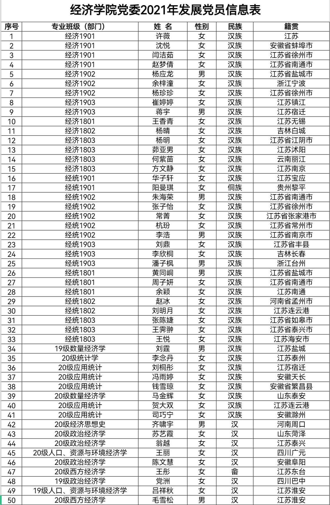 根据《发展党员工作实施细则》有关规定,经公司基层党支部考察、公司党委预审,拟接收许薇等50名同志为中共预备党员。现将名单予以公示: