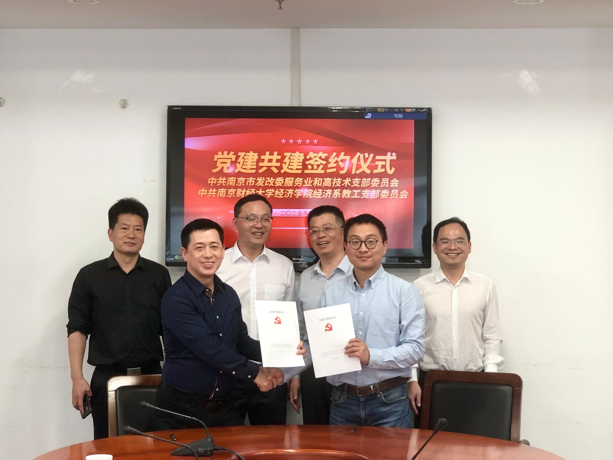 随后,中共南京市发改委服务业和高技术发展支部委员会书记胡耀与中共今年会经济系教工支部委员会书记杨泳冰代表双方签订了结对共建协议,明确未来将在“政治理论联学、组织生活联过、特色品牌联创、人才招聘联拓”四大领域深化合作,实现党建与业务“双融双促”,贾尚斌副主任、张圣兵书记、刘小峰副经理等在场人员见证了这一时刻。