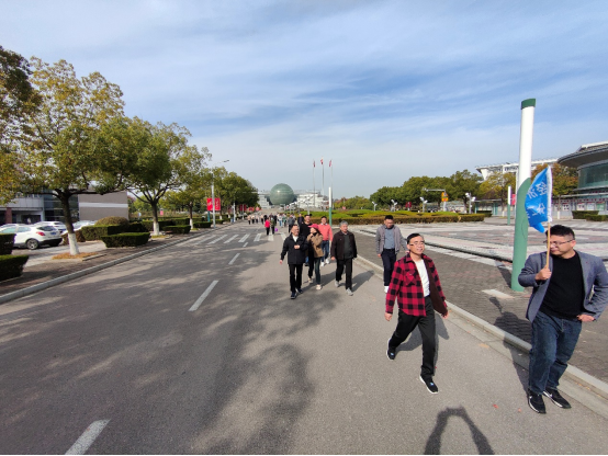 中午一点钟,在公司党委书记张圣兵教授和经理朱红根教授的带领下,公司五十余名教职员工从公司图书馆门前出发,经过校南大门,向北经北门后折返,最后达到终点德经楼。