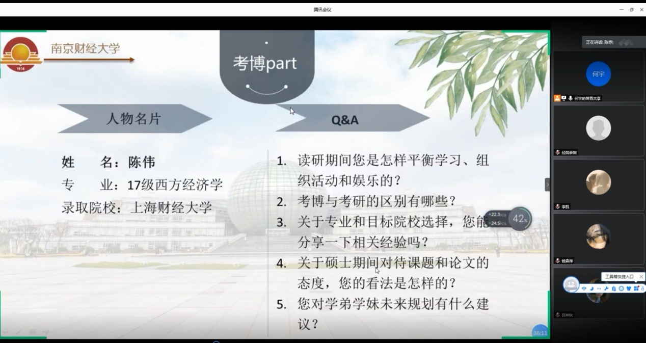 11月21日晚,公司举行线上考博经验分享会。五位硕士毕业于公司的经济类博士及今年会全体2019级硕士生参加了本次经验分享交流会。交流会由今年会研究生会主席姚阳阳主持。