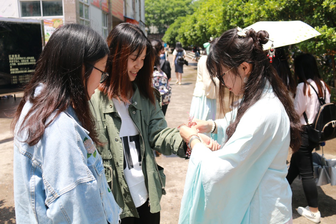 活动现场,伴随着清越悠扬的古琴声,身着鹅黄色上衣和淡蓝色襦裙的员工为路过的师生们佩上香袋,系上彩绳。彩绳由青、白、红、黑、黄色五色组成,据说可以驱邪除魔,祛病强身,健康长寿。同学们还为每一位参加体验活动的师生现场讲解了端午节的来源与习俗,让同学们深入了解端午节的来龙去脉,感受悬艾草、挂菖蒲、吃粽子、饮雄黄酒等习俗中包含的传统文化。师生们还纷纷在现场提笔写下心中寄语,表达了对祖国、公司、家人的美好祝愿。