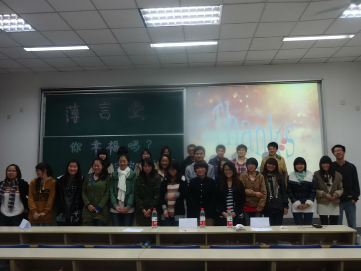 2012年11月9日晚七点整,专一101,厚薄学社主办的第一届薄言堂“你幸福吗?”演讲比赛正式开始。本次比赛的评委由公司员工会副主席韩颖、厚薄学社前社长宗琴和红山公司厚薄学社负责人王乃鑫担任。厚薄社员陈炎和王文静共同主持此次比赛。