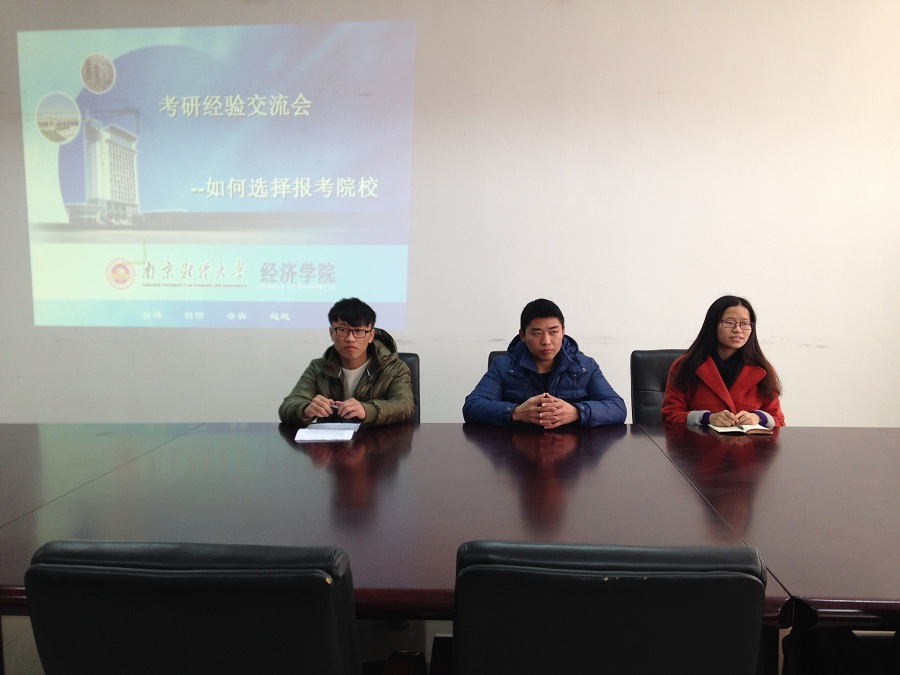 11月27日下午,仙林校区经济学科楼307室举办了以“如何选择考研院校”为主题的考研经验交流会,此次交流会由员工处主办,公司承办。交流会邀请到的主讲嘉宾是仝玉超、倪蓉、马磊三位同学。