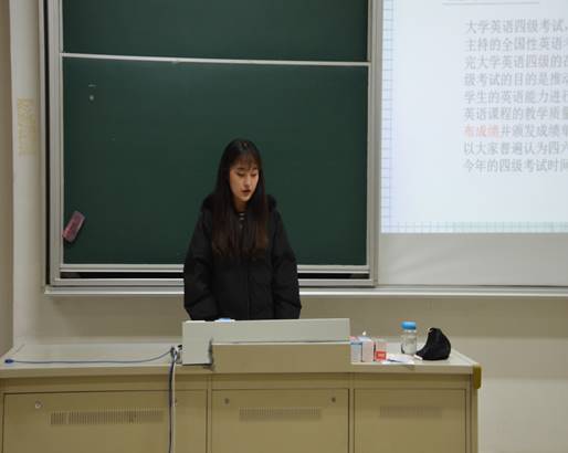 本次活动共分为两个部分。第一个部分是大学英语四级考试经验分享环节。经济1803班的戴紫霜同学为大家分享大学英语四级考试经验技巧。戴紫霜同学在过去一年里,以646分通过大学英语四级考试、以645分通过大学英语六级考试。她主要从三个方面进行分享:一、遵守考试规则,备齐考试用品。由于大学英语四级考试是国家级别的考试,因此19级大一新生一定要遵守考试规则。如带好员工证、身份证和准考证,三证齐全才能参加考试,另外,迟到的考生不能参加考试,因此要提前5-10分钟进考场。同时,考生一定听从考试指令。此外还要备齐考试用品,如考试需要填涂机读卡,因此要准备好2B铅笔等文具,听力考试需要使用收音机,要准备好电池和耳机,另外鉴于移动通讯工具不能带入考场,考试期间需要查看时间的同学请准备好手表等。二、戴紫霜同学为大家展示大学英语四级的考试题型和流程,并将自己在参加考试时对各种题型的时间分配介绍给大家,帮助同学们强化把控考试时间的能力。三、戴紫霜同学还贴心地为同学们传授自己在大学英语四级考试答题时的一些技巧,如听力部分在不能完全听懂的情况下尽量选择听到的句子,阅读理解部分可以从原文中寻找答案,翻译部分尽量用简洁的语句完整地诠释原句语意等,她最后鼓励同学们好好复习迎考。