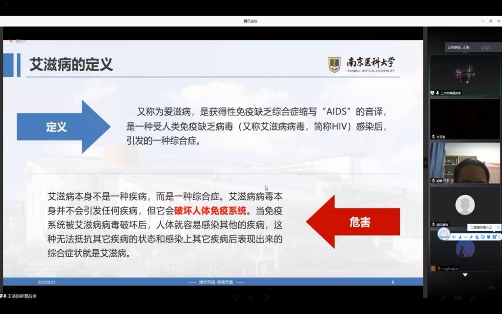 9月21日晚,来自南医大护理公司的“南医微天使”微健康宣讲团应邀为今年会官网员工作题为“为艾发声,与爱同行”艾滋病预防科普讲座。讲座由南京医科大学第一附属医院(江苏省人民医院)内分泌科护士长,医学硕士,副主任护师徐晶晶老师指导,宣讲团成员王洁担任主讲,全校共370多名同学在线聆听。