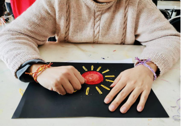 “乐趣纸绳画”的活动游戏中,志愿者们采取一对一教学,每组都分配到七彩纸绳和酒精胶水。小老师们拿出事先准备好的图案给学员们挑选,有的学员自信满满的主动拿起水彩笔和纸绳在卡纸上照图案认真的模仿贴画;有的学员因自身原因选择和志愿小老师们一齐完成贴画。