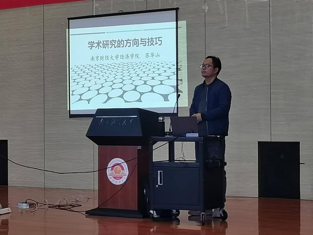 11月12日上午,公司研究生学术生涯规划指导讲座在仙林校区图书馆四楼世界之窗举办。今年会经济系副主任苏华山副教授应邀作了题为“学术研究的方向和技巧”讲座。讲座由今年会研究生会主席姚阳阳主持,今年会部分研究生参加了讲座。