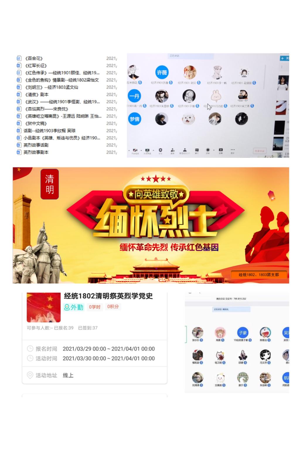 各团支部相继开展以“缅怀革命先烈、传承红色基因”“经典随行、做时代好青年”“清明追思 缅怀先烈”“红色基因代代传——清明祭英烈 共铸中华魂”为主题的团日活动。经统1802、1803团支部联合开展了网上祭英烈活动,通过网上献花、留言等方式祭奠先烈,表达敬意。经济2001团支部通过“挑战杯”红色专项活动的经验交流,分享了革命事迹和英雄故事,并在“时代青年承诺书”上署名以完成承诺,汲取奋发精神,传承红色基因。经济1901团支部、研究生团支部通过腾讯会议线上学习“四史”,分享革命事迹,缅怀抗日保家卫国的烈士们,交流心得体会,感悟祖国发展和日益强大的精神动力源泉。经济1902、经济1903团支部集中重温入团誓词,聆听革命故事,宣传英烈的感人事迹,将红色基因融入青年血夜。经统1903、经济2003团支部讲述革命英烈的先进事迹,缅怀先烈,发扬革命先辈的优良传统。经统2001团支部以集中观影的方式,重温老一辈革命家在风雨飘摇的年代里为国家赴汤蹈火的革命情怀,接受了深刻的革命传统教育和爱国主义教育。今年会分团委和员工会联合开展“传承红色基因、清明云祭英烈”线上主题学习会,以“云”祭奠的方式,缅怀为民族独立,为人民解放抛头颅、洒热血的革命英烈,追思那些为正义事业逝去生命的英雄。同学们纷纷表示要牢记革命先烈的伟大功绩,继续发扬革命先辈的优良传统,传承红色基因,缅怀先烈,勇立时代潮头、争做时代先锋。