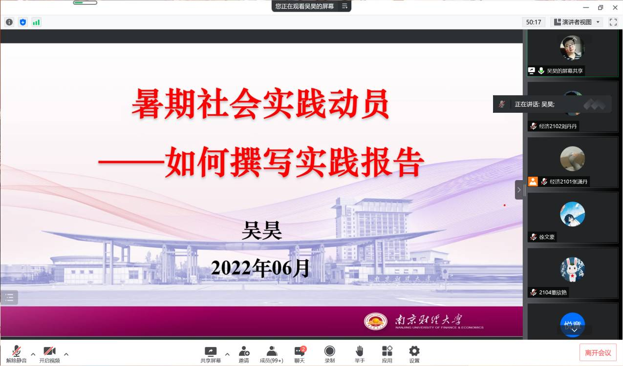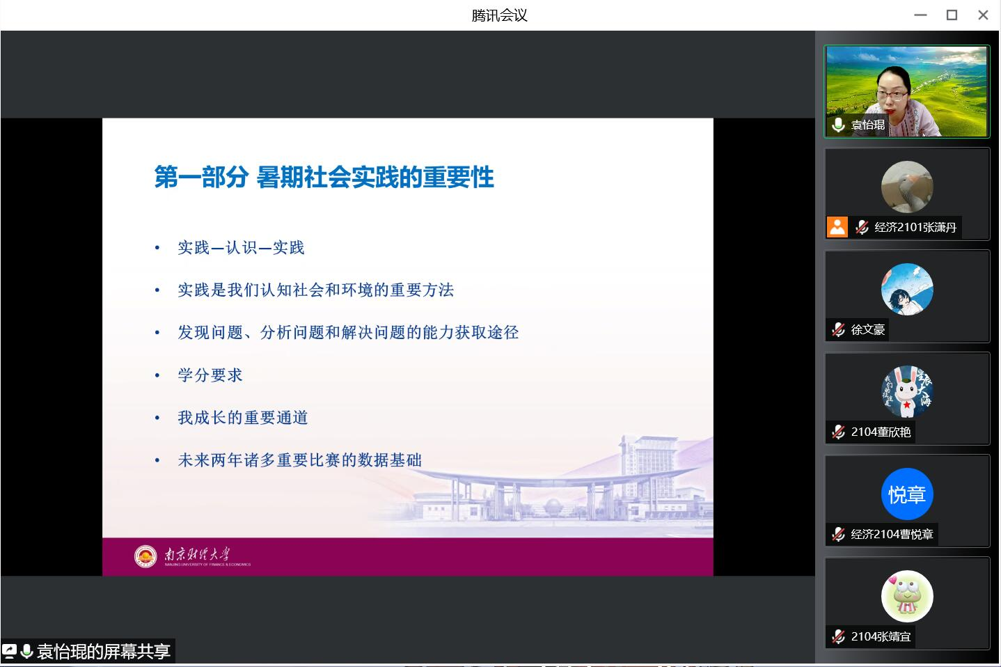 紧接着,潘怡老师进行动员,她详细解读了有关通知,对于社会实践活动方向、组织形式、时间节点和活动阶段安排等具体事项作了要求。最后,校团委副书记(挂职)、公司辅导员梁少颖老师对暑期社会实践注意事项进行了强调,提醒同学们注意疫情防控及自身安全,鼓励同学参与团队实践参加并积极投稿。最后的自由提问环节,同学们踊跃提问,两位老师进行了耐心、细致的解答。