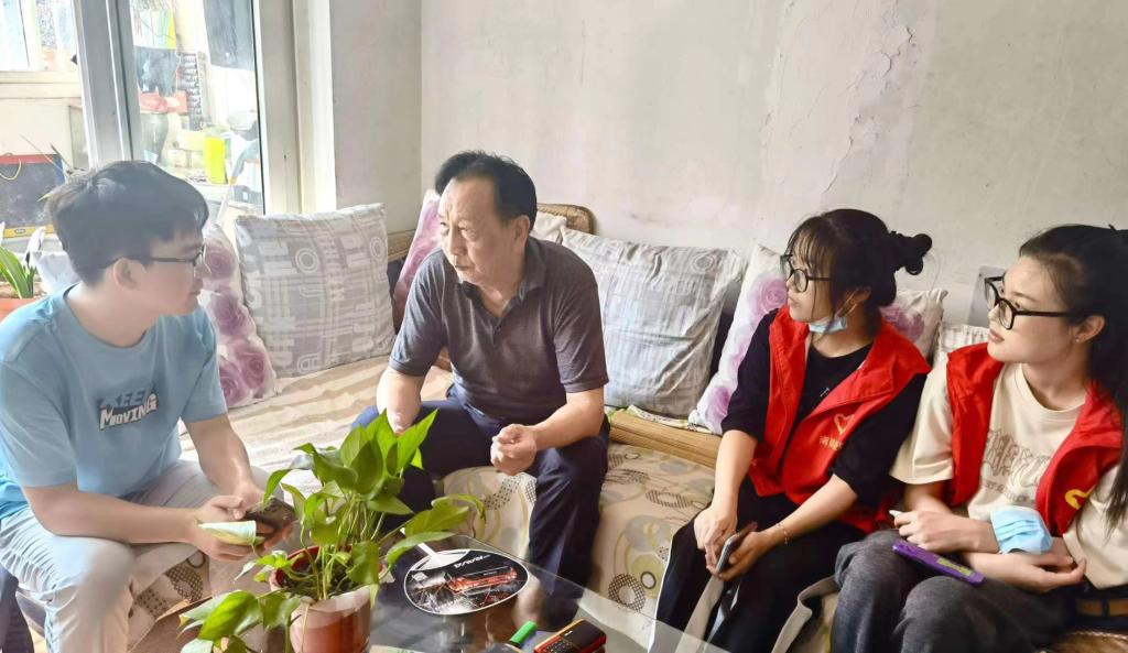 而郭礼宝爷爷一看到志愿者们便露出了和蔼的笑容,将大家热情地迎进了家门。他提到,自己的两个孙子也是老员工,看到志愿者们倍感亲切。随后,郭礼宝爷爷向志愿者们介绍了他平时作为司法调解员的工作感想,鼓励青年们积极服务社会,贡献自我。郭礼宝爷爷还和志愿者们分享了工作中遇到的调节老员工心理的故事,鼓励青年人一定要积极生活,热爱生命。最后,郭礼宝爷爷深情地嘱咐志愿者们:“大家记住要努力学习,报效国家。”