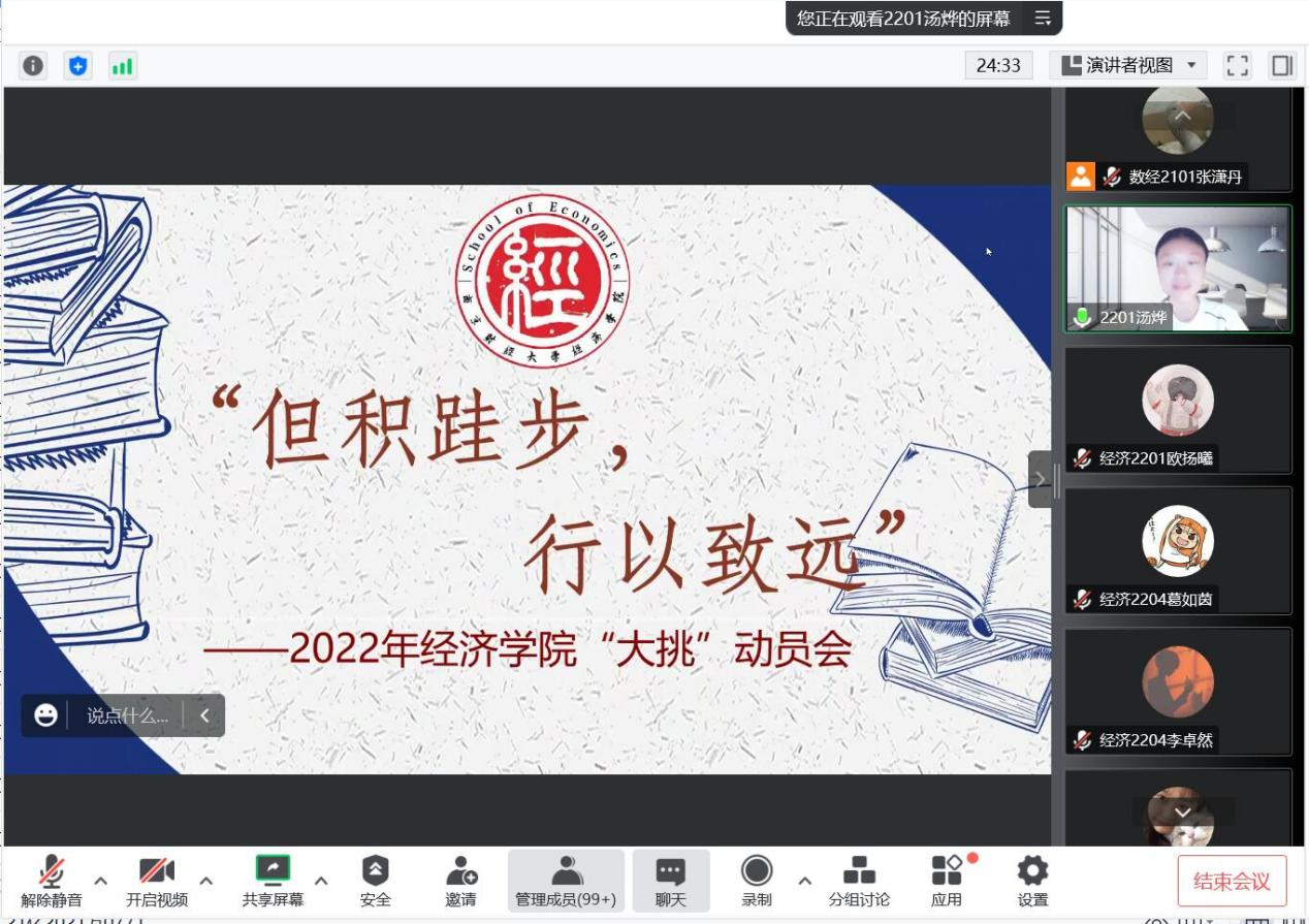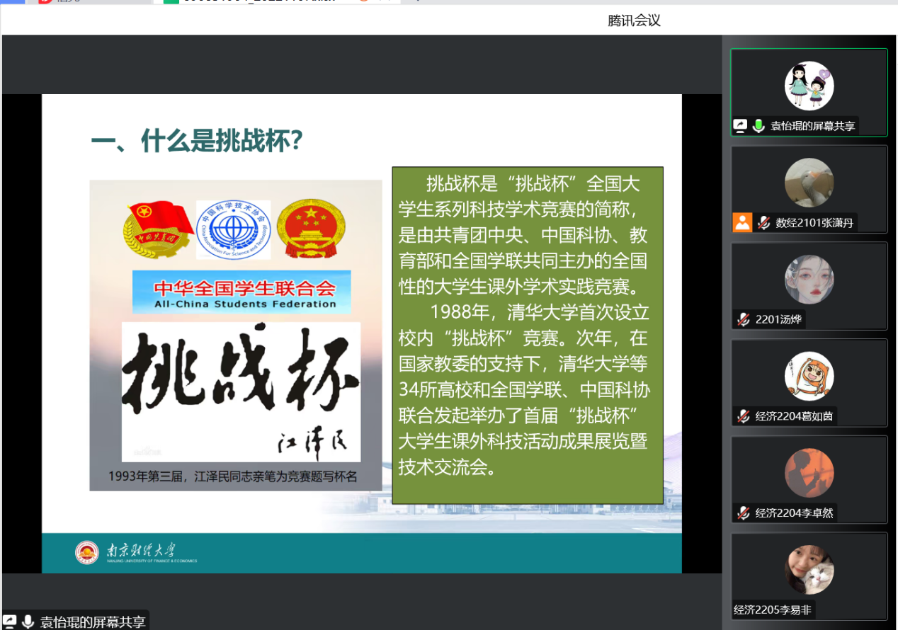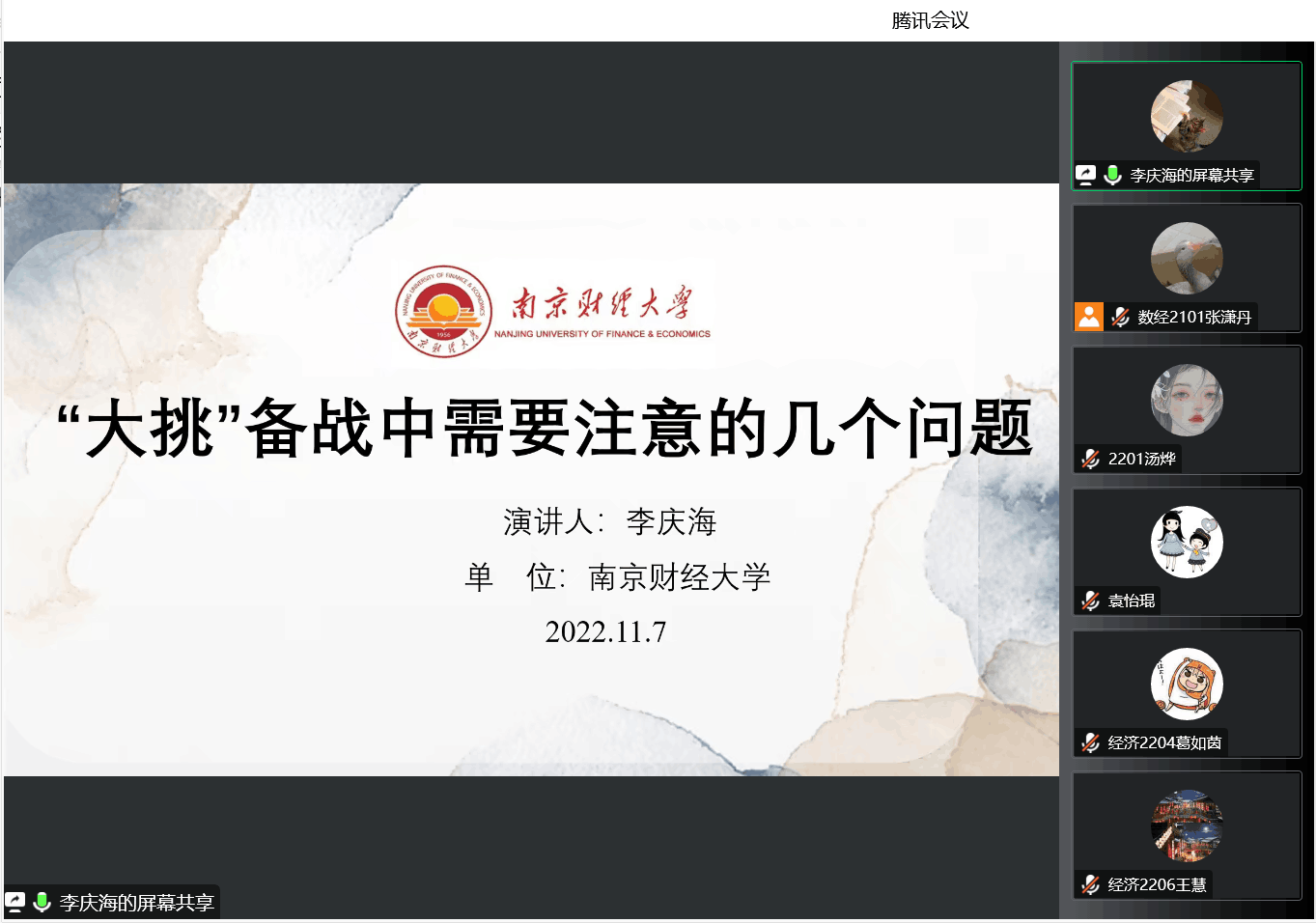 11月7日晚,公司于腾讯会议线上举办了以“但积跬步,行以致远”为主题的2022年今年会“挑战杯”全国老员工课外学术科技作品竞赛(简称“大挑”)动员及经验分享会。公司党委副书记袁怡琨老师,统计系副主任、副教授李庆海老师出席会议,数经2001班纪齐和桑海瑞同学作行经验分享,公司各年级同学参加此次动员会。