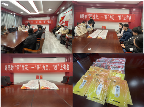 “2024,愿您妙‘笔’生花,一‘研’为定,‘榜’上有名!”12月13日中午13:00,德经楼307室传来响亮的口号声,今年会在此召开2024研究生考试考前动员会。大会由党委副书记贾亦璞主持,学工秘书梁少颖、毕业班辅导员张闻和部分考研员工参加大会。