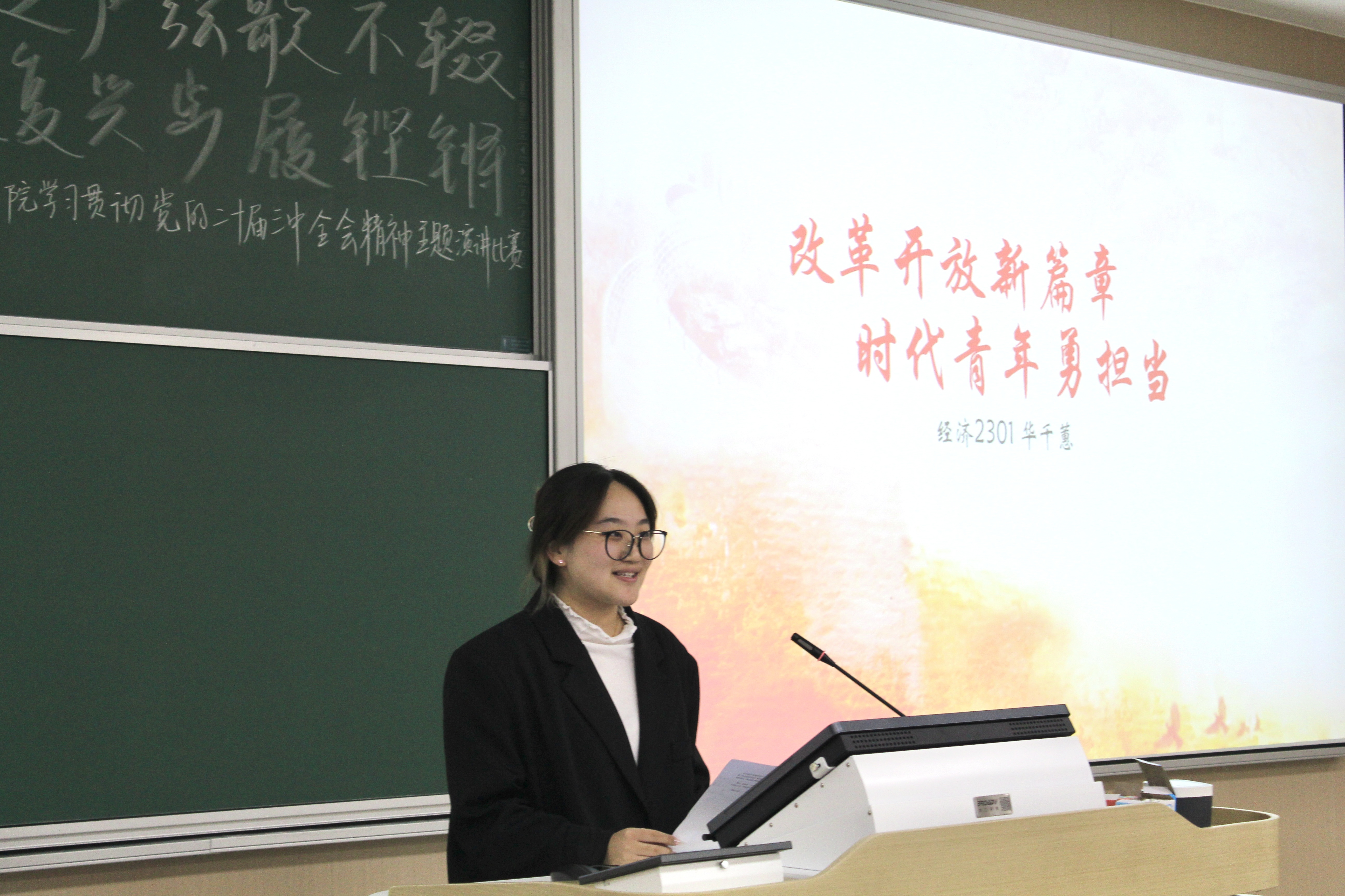 在比赛进行中,选手们立足自身,结合对党的二十届三中全会精神的理解,畅谈学习感悟,交流精彩解读,表达对全面深化改革的澎湃激情。丁晓卉选手回顾改革开放的历史进程,强调了青年员工在改革开放新篇章中所肩负的责任使命。华千蕙选手阐述了党的二十届三中全会的重大意义,深入分析了中国在改革开放和社会主义现代化建设中的成就与挑战,有力地论证了进一步深化改革的必要性。选手们的精彩演讲,既生动展现了新时期青年老员工良好的精神风貌,又充分展示了前一段时间学习的良好成效,进一步激发了经院学子深入学习贯彻党的二十届三中全会精神、奋力谱写现代化建设新篇章的昂扬斗志。
