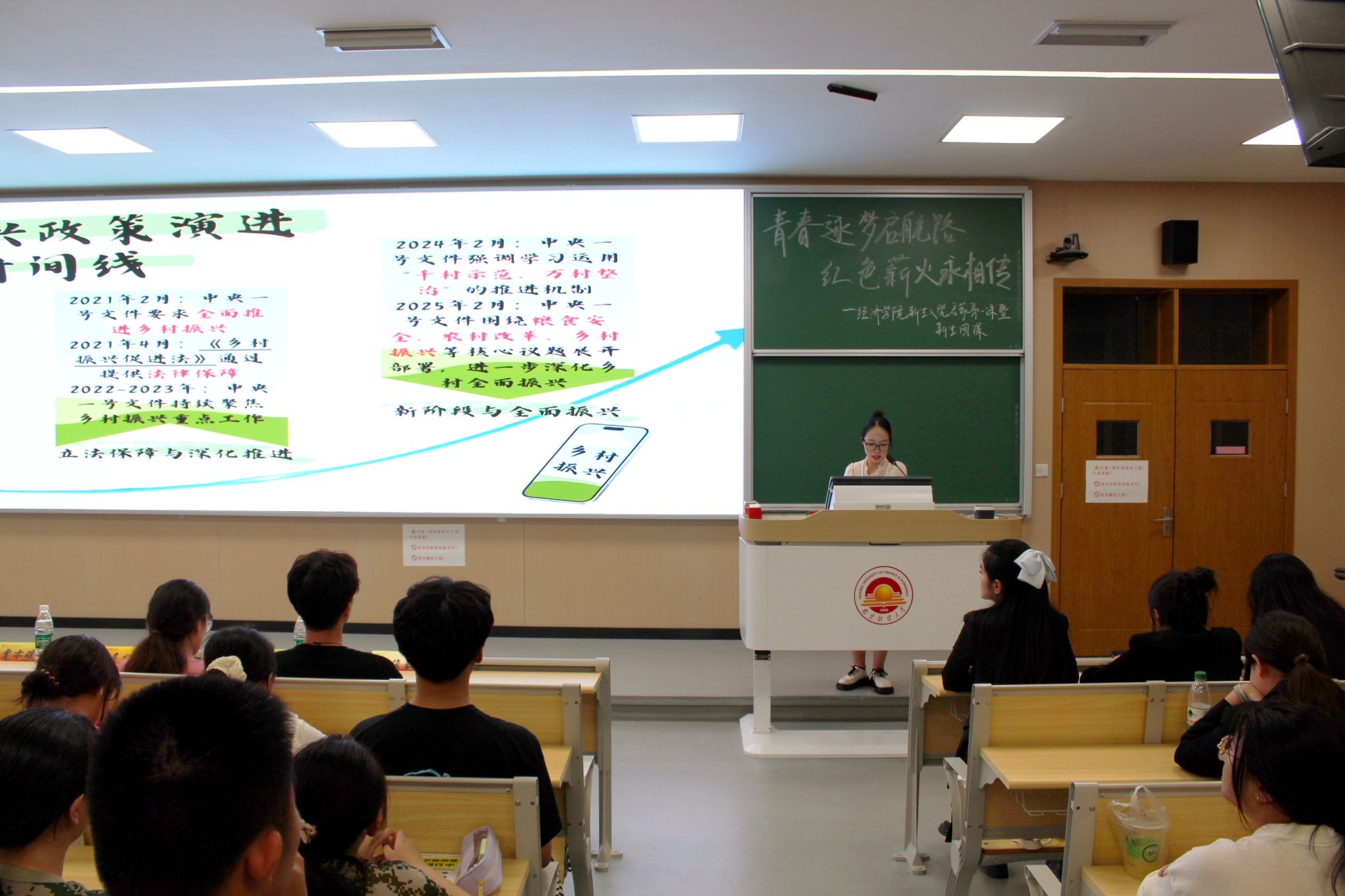 接着,经统2201秦嘉悦同学为同学们带来了一堂生动的团课,聚焦“明国策·识大势”“赴基层·绽芳华”“躬行践·真知悟”“当先锋·启新程”四个维度展开。她首先带领同学们梳理乡村振兴政策演进脉络,介绍老员工村官、西部计划、“三支一扶”等基层服务路径;随后结合自身参与的国家级大创项目暑期实践经历,分享团队深入12个省份调研形成的成果。此外,她通过政策解读、实践案例与成果展示,展现青年学子扎根基层、服务粮食安全的担当,为新生树立了“以知促行、以行践知”的榜样。