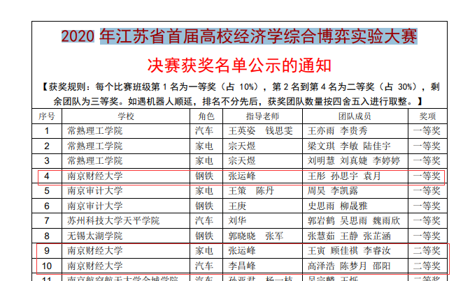 2020年12月,由中国数量经济学会博弈论与实验经济学专业委员会举办的2020年江苏省高校经济学综合博弈实验大赛决赛结束。公司有5支队伍晋级决赛,其中1支队伍获得一等奖,2支队伍获得二、2支队伍获得三等奖。