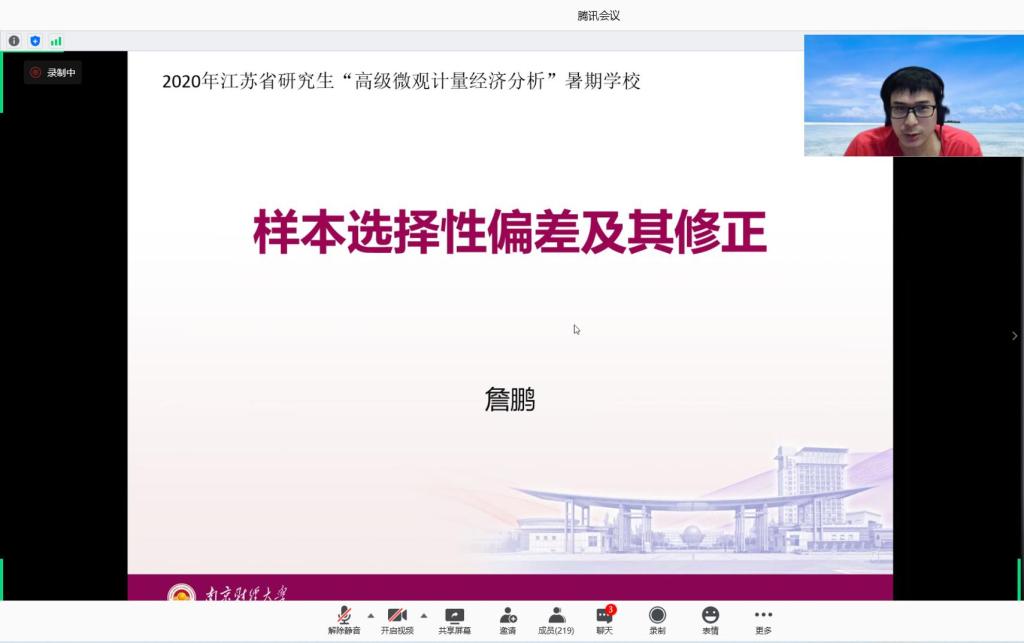 詹老师以已婚女性的教育收益率为例,讨论在没有进入劳动力市场的已婚女性观测数据缺失的情况下,“能否用正在工作的女性的工资收入估计全体已婚女性的教育收益率”这一问题作为开场白,进而引出本次讲座的主题——样本选择性偏差。在阐述完“样本选择性偏差是什么?”的问题后,詹老师利用演绎法计算了样本选择性偏差对OLS估计结果影响的数学表达式,进而提出修正样本选择性偏差的方法,即Heckman两阶段法,并在Stata上利用具体数据进行了实现。随后,詹老师结合论文,给学员们展示了实际研究中所遇到具体的样本选择性偏差的问题。最后,詹老师对学员们关于样本选择性偏差提出的疑问逐一进行了解答,并提醒学员们不仅仅要学方法,更要会使用方法。