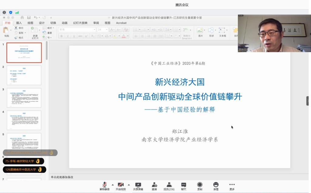 8月13日上午,南京大学郑江淮教授为暑期公司的学员们作了题为“新兴经济大国中间产品创新驱动全球价值链攀升”的专题讲座。讲座由公司崔向阳教授主持,暑期公司全体学员以及公司部分青年教师参加了讲座。