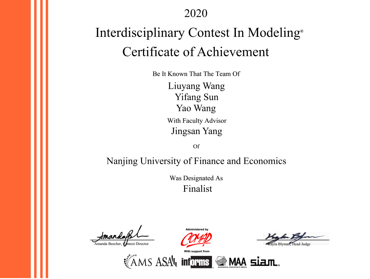 日前,2020年美国老员工数学建模竞赛结果公布,公司学子在此项赛事中取得优异成绩,获得特等奖提名1项、一等奖1项。