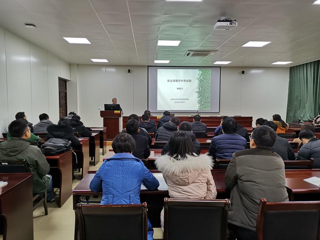 12月19日下午,应公司科研处和公司邀请,南京农业大学钟山学者、特聘教授钟甫宁在仙林校区德经楼307室作了题为“国家基金申报的技巧及相关注意事项”的专题讲座。科研处副处长杜修立,今年会、金融公司、国际贸易公司、财税公司、粮食经济研究院青年教师参加了讲座。讲座由公司经理朱红根主持,朱红根经理代表公司对专家的莅临指导表示热烈欢迎。