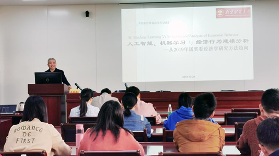 10月29日,中国社会科公司数量经济技术经济研究所王国成研究员在公司仙林校区德经楼307会议室作了题为“人工智能、机器学习与经济行为建模分析——从2019年诺奖看经济学研究方法趋向”的报告。报告由公司统计学学科带头人白先春教授主持,韩中副教授、孙瑞博副教授、周宁副教授、康宁副教授、詹鹏博士等中青年教师和部分研究生参加了讨论。