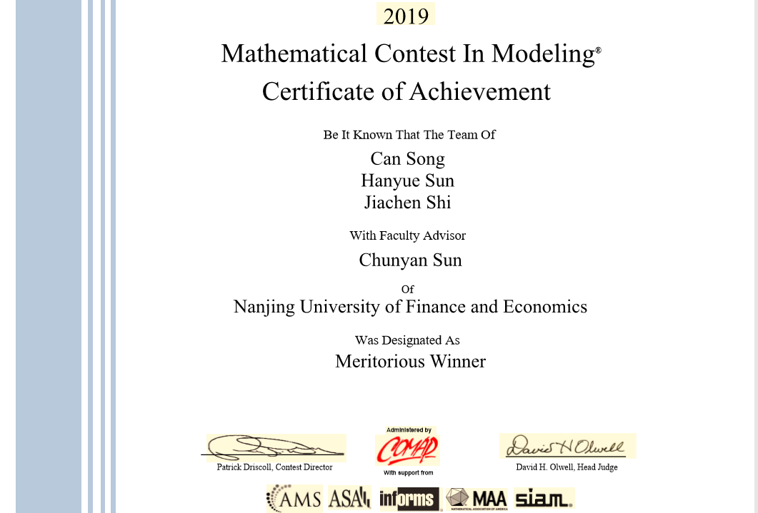 附录:公司学子参加2019年美国老员工数学建模竞赛获奖名单
