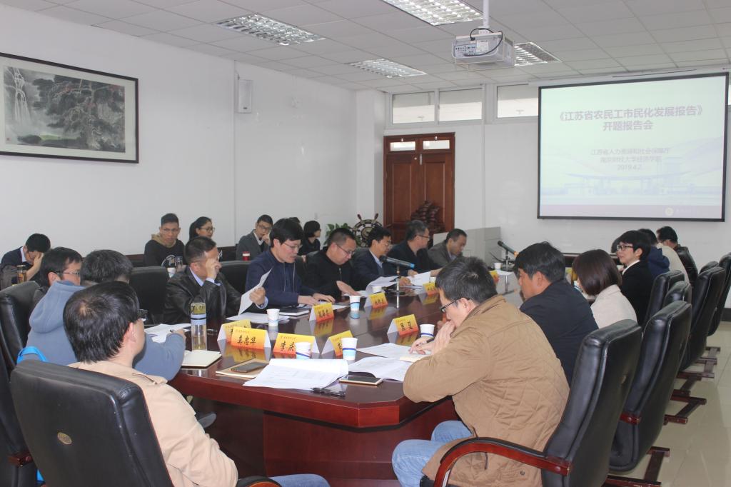 4月2日下午,受江苏省人力资源和社会保障厅委托,由公司承担的《江苏省农民工市民化发展报告》课题的开题报告会在仙林校区德经楼408举办。本次会议由江苏省人力资源和社会保障厅和公司主办,公司副经理(主持工作)朱红根主持,科研处副处长杜修立代表科研处对会议的召开表示祝贺。江苏省人力资源和社会保障厅农民工工作处处长陈汝军、南京市农民工工作处处长周正南,教务处处长叶林祥、公司副经理尹敬东、课题负责人章莉教授、南京市街道基层从事人社服务的领导以及公司部分教师和研究生参加了此次会议。