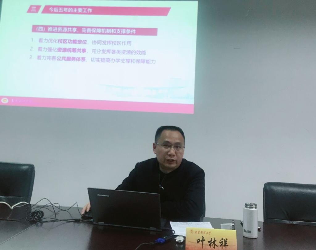 叶林祥教授首先简要说明了第三次党代会概况,并通过回顾五年来的工作成绩,对公司的思想建设、党建工作、办学水平和办学环境给予肯定。叶教授认为,公司要向着“加快建设特色鲜明的高水平财经大学”的目标不断前进,以习近平新时代中国特色社会主义思想为指导,进一步实行五项战略,在保留公司财经底色、粮食特色的基础上不断创新,坚持引培并举,拓展国际办学的广度和深度,保证师生员工在共享发展中获得更多的满足感、幸福感。叶教授指出,公司今后五年的工作要以优化布局、协同发展、完善治理、资源共享和增进福祉为重点展开,坚持优化建设布局,形成高水平大学办学体系。叶教授最后强调,此次公司党代会是一次统一思想、凝心聚力的大会,必将对公司改革发展产生重大而深远的影响,载入公司发展的光辉史册。