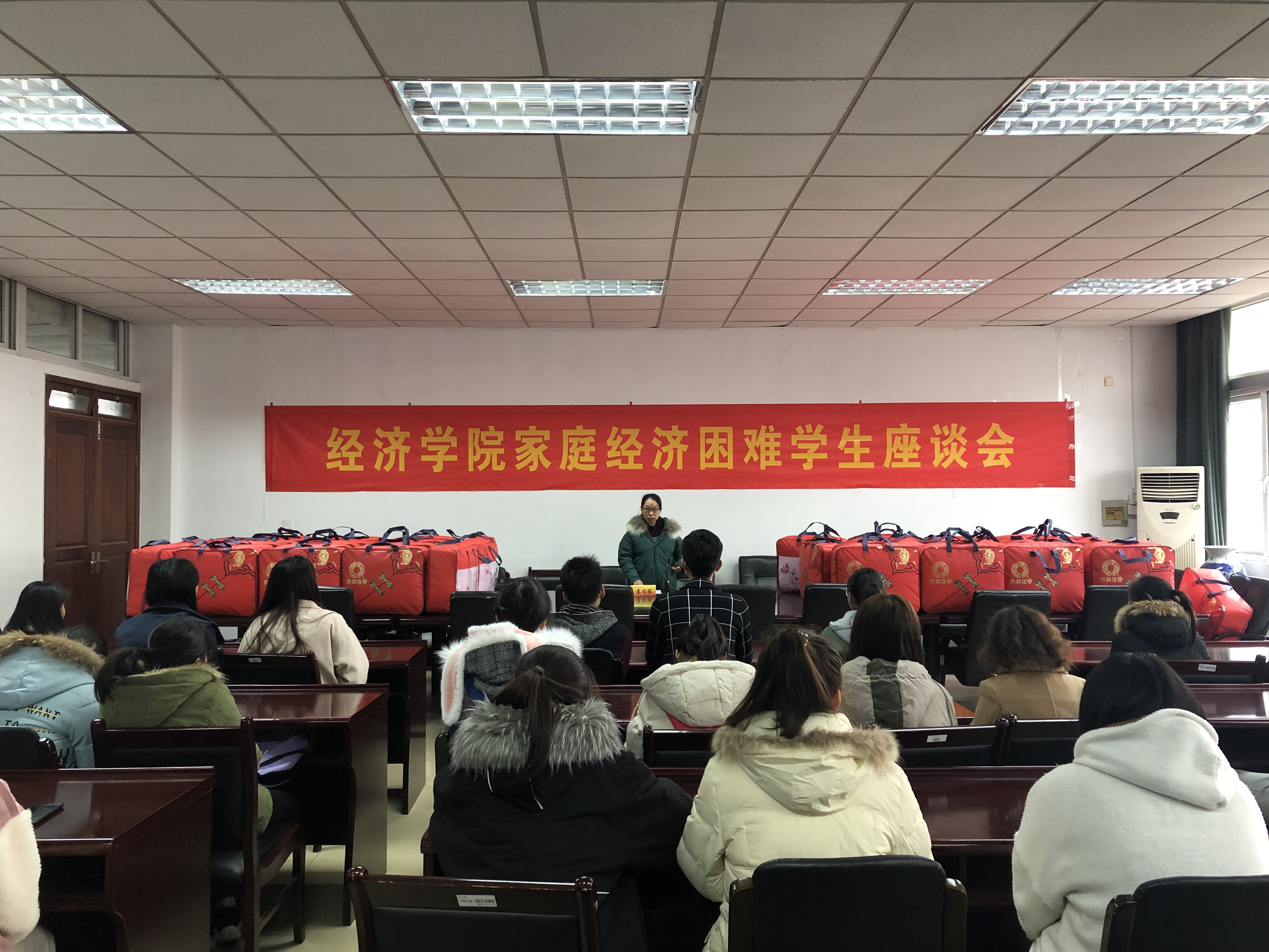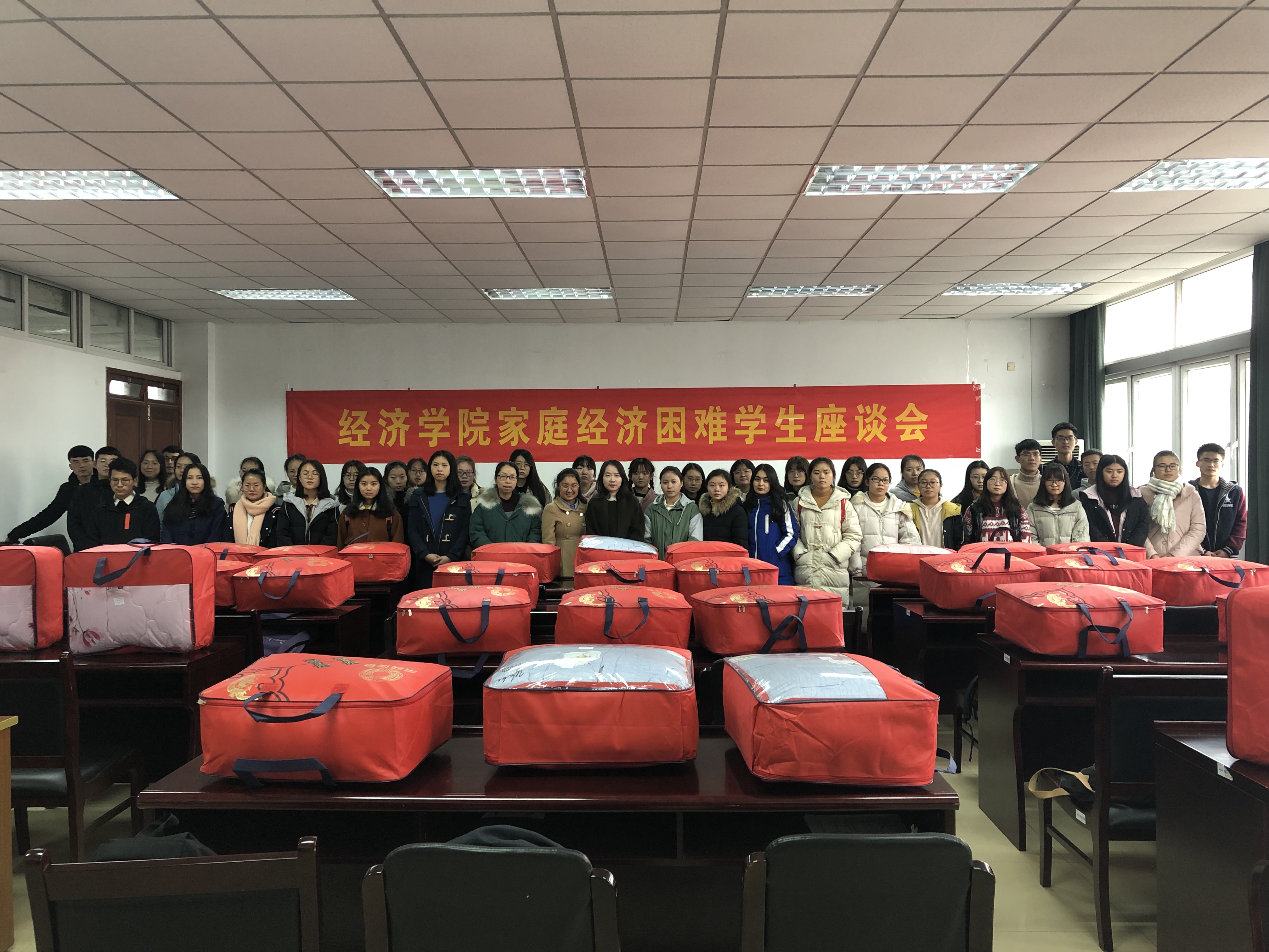 座谈会后,老师们为每一位同学发放御寒冬被,为学子们在寒冷的冬天送上一份温暖和祝福,预祝困难员工们在即将到来的期末考试中取得优异的成绩。