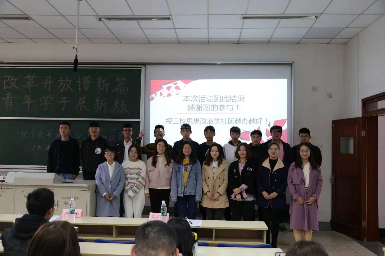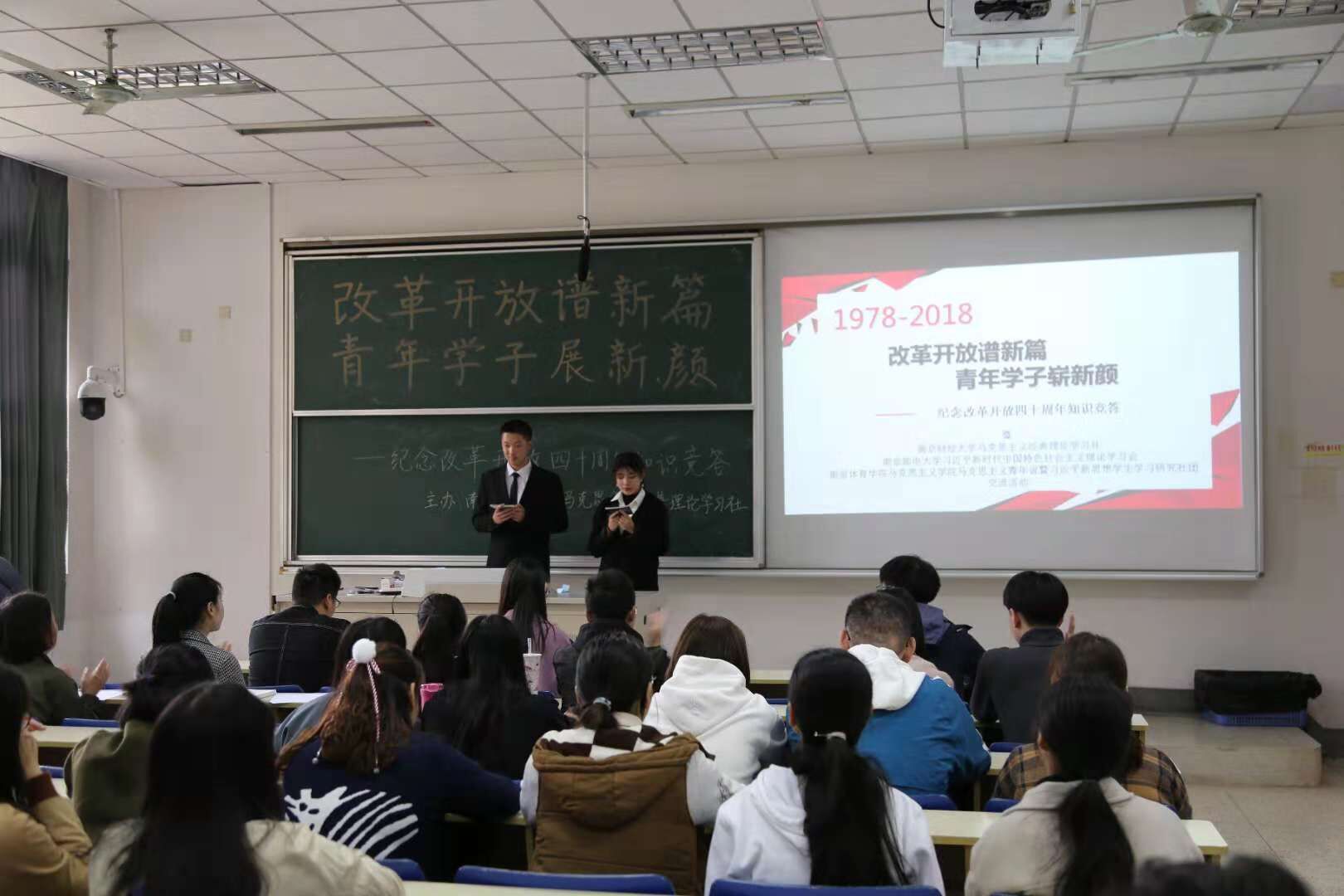 11月11日下午,公司马克思主义经典理论学习社联合南京邮电大学习近平新时代中国特色社会主义思想学习会、南京体育公司习近平新思想员工学习研究社,在德经楼101举行了“改革开放谱新篇,青年学子展新颜”——庆祝改革开放四十周年知识竞答活动,公司党员、入党积极分子们到场观看了比赛。 活动正式开始前,公司马克思主义学社社长庞萍、南邮习学会会长吴忧、南体马院新思想研习社团社长翁凡棋依次进行了发言。首先,庞萍同学以主办方身份对来自南邮、南体的社团同仁们表示了热烈的欢迎和衷心的感谢,同时对此次知识竞答活动提出了要求和期望,并表示希望今后加强三校思想政治类社团的交流与合作。吴忧同学对社团的未来发展方向提出了热切展望,翁凡棋同学则表示希望加强社团间的联系并欢迎兄弟院校社团去南体进行交流。 本次庆祝改革开放四十周年知识竞答活动分为必答题、抢答题和风险题三个环节。选手们一个个你追我赶、不甘示弱,对改革开放四十年的历史都有较好的理解和掌握,场上竞争十分激烈。经过激烈的角逐,南财队获得了卓越青年奖,南邮、南体则分别精神文明奖和思想进步奖。活动最后进行了各队的颁奖和合影环节。 此次改革开放四十周年知识竞答宣扬了改革进取的创新精神,促进了青年学子对相关历史的深入了解,展现了当代青年学子积极向上的精神风貌。
