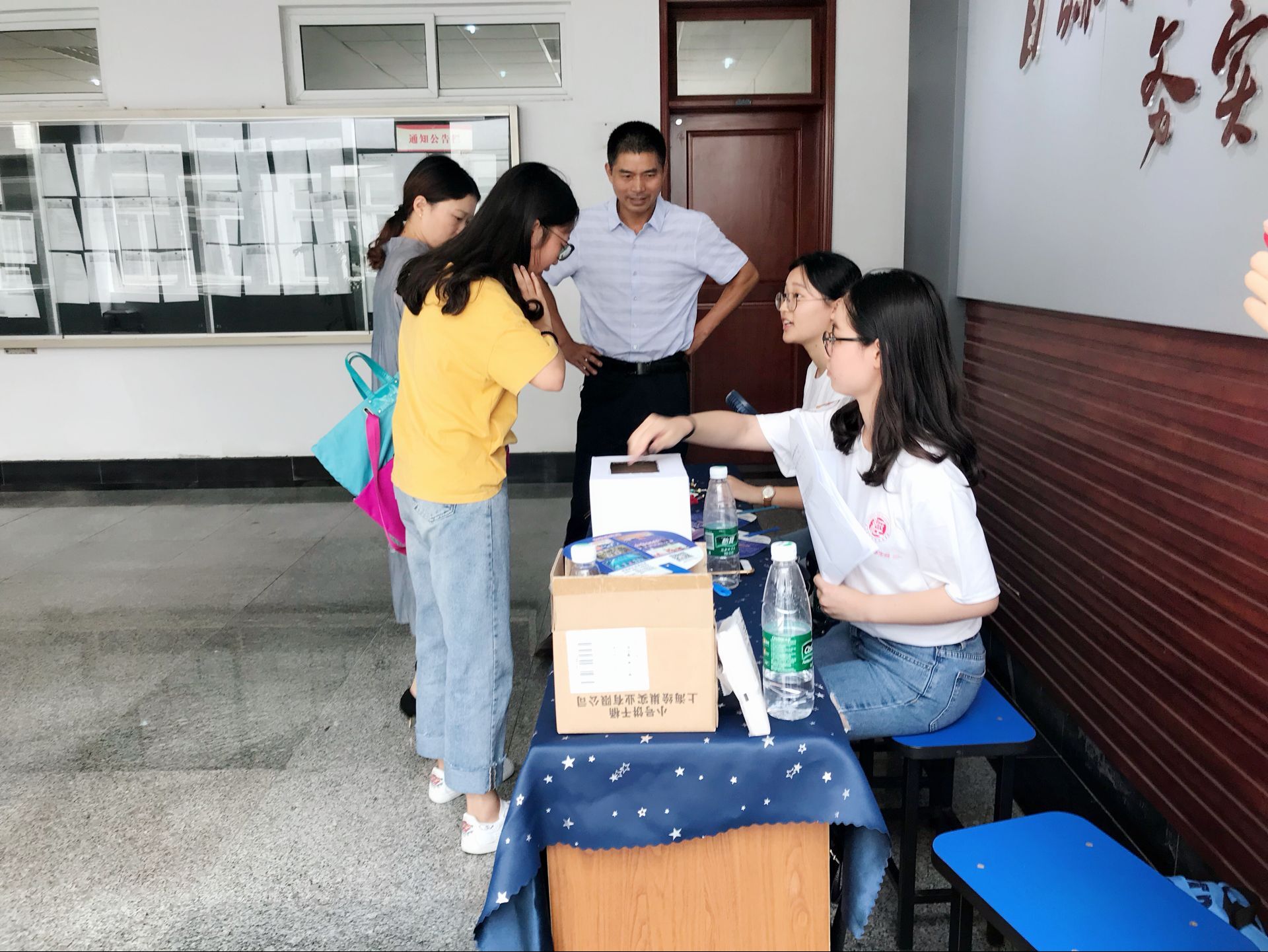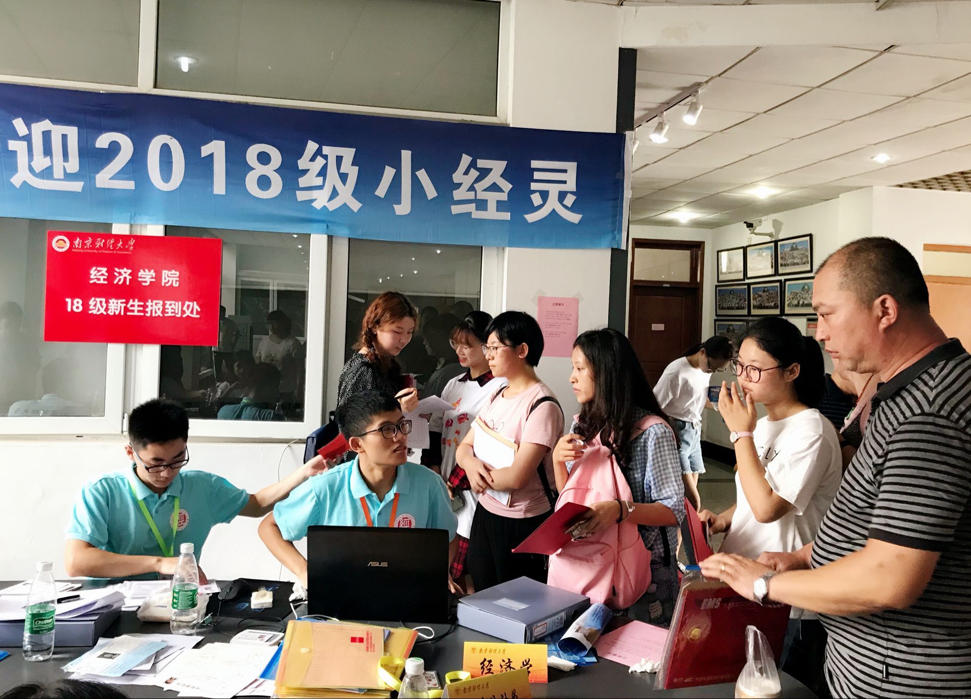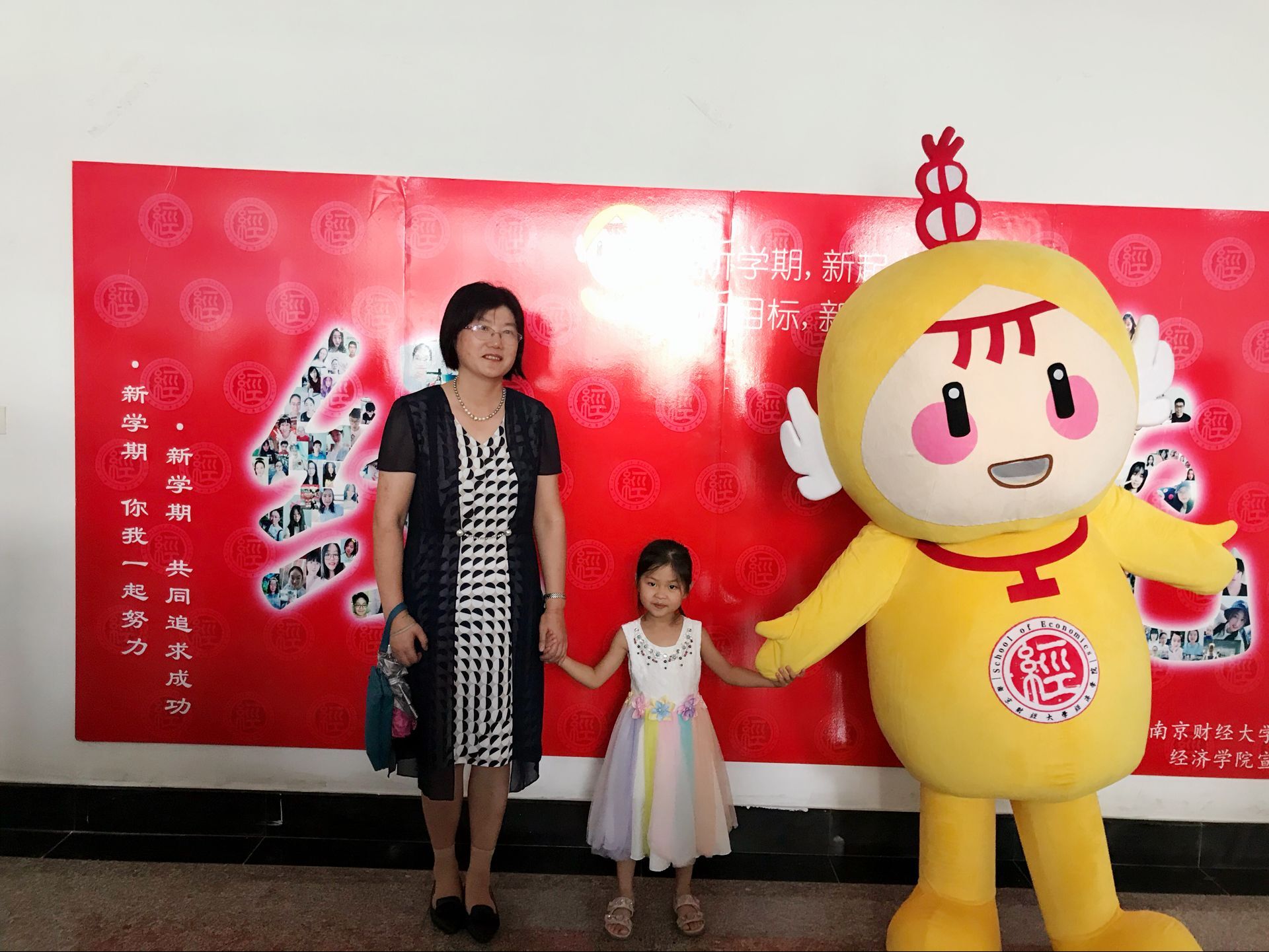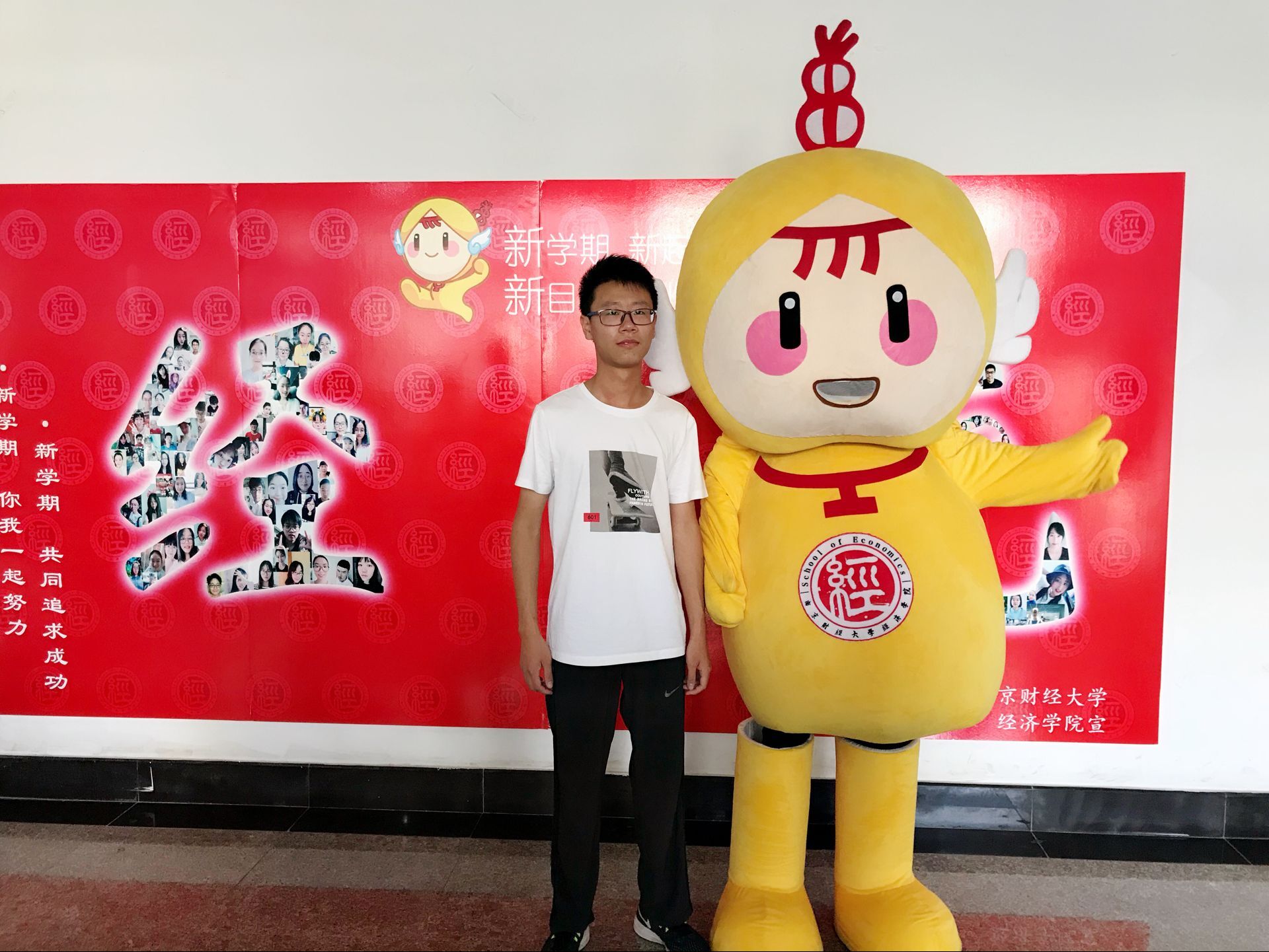 虽然时间尚早,但已有新生前来报到,德经楼三楼逐渐被忙碌的气氛包围,老师和志愿者们有条不紊地进行着一站式学籍注册,报到登记,发放资料,并邀请同行的家长参加下午的家长会。 报到处最为出挑的可能是志愿者装扮的今年会吉祥物“小经灵”:黄色的衣服、憨态可掬的笑容,打招呼、卖萌、求拥抱、求合影,让初来公司的新生们感受到大学的轻松和温暖。登记结束后,新生和家长们在由新生笑脸照片分别拼成的“经“和”统”字样的照片墙处与小经灵合影留念。宋学锋董事长和邱伟芬副董事长也在百忙之中亲临迎新现场,了解新生的入学情况,并与小经灵合影。