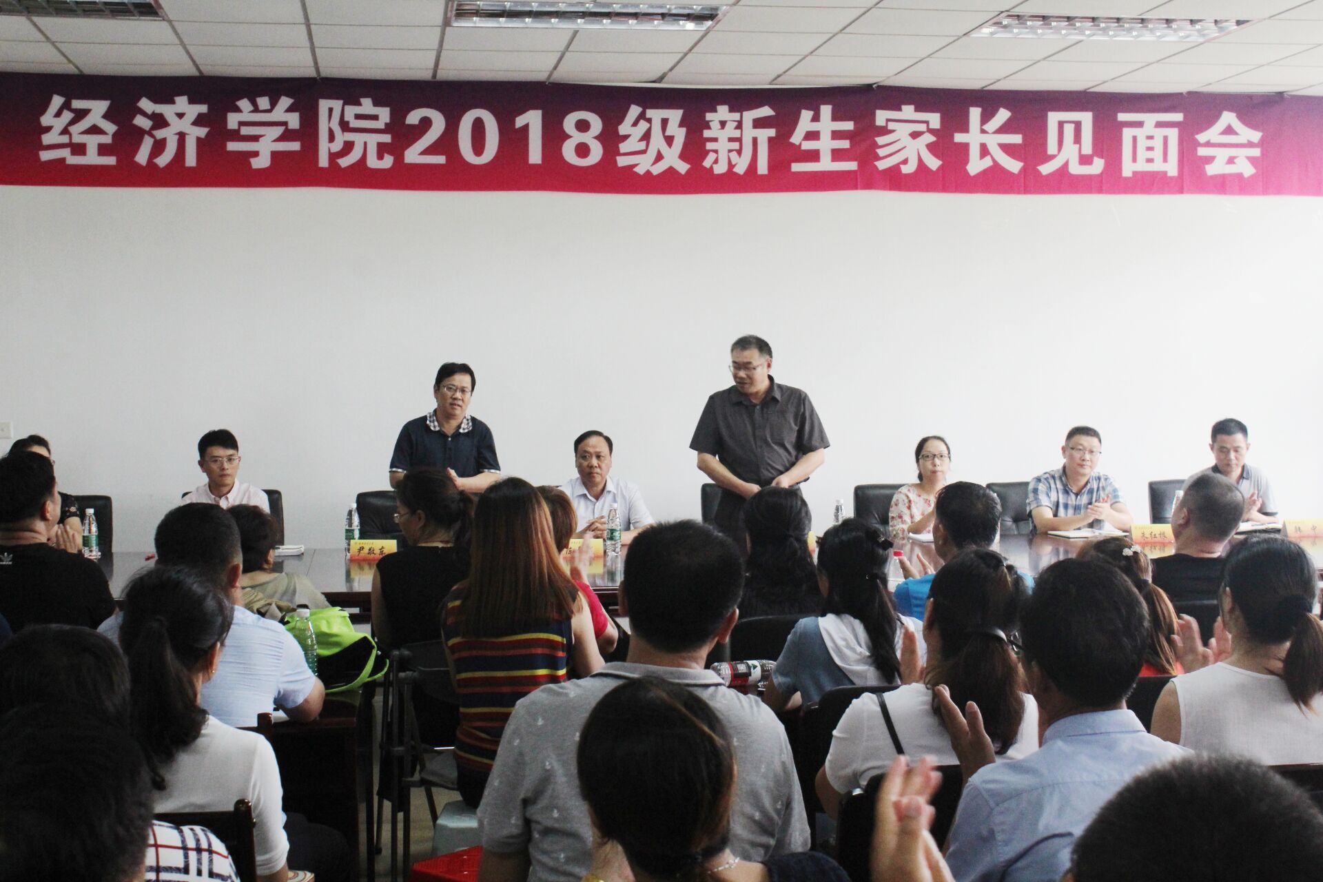 下午两点半,德经楼307会议室座无虚席,公司2018级新生家长见面会在此举行。公司党委书记陈章龙、公司党委书记陈耀辉、公司党委副书记袁怡琨、副经理尹敬东、张成、朱红根,经济系和统计系教师代表等出席此次会议。