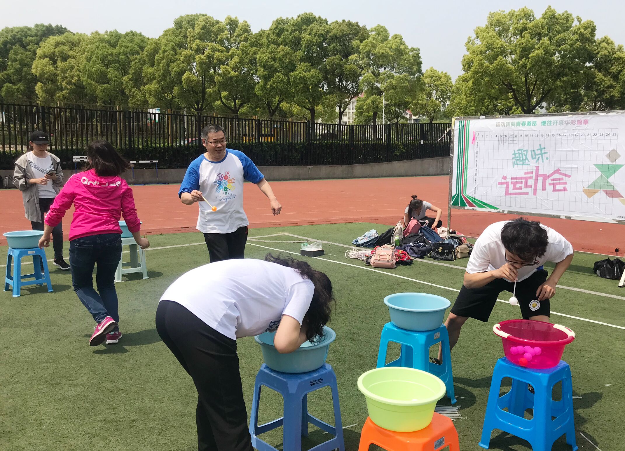 “砥砺前行”比赛中,师生组抓稳节奏,从容不迫,在一分钟内一人用筷子将第一个碗里的乒乓球夹到第二个碗里,另一人用吸管将第二个碗里的乒乓球吸到第三个碗。“跨越入世”比赛中,师生穿上麻袋双腿并拢,奋力向前跳跃,交替完成来回的袋鼠跳。“南方的春天”中,教师和员工穿上今年会院服接力传送气球,比赛激烈角逐,精彩纷呈。“神舟入星海”是一人抛球一人用篓子接球。有的队伍中,老师瞄准篓子,博力一抛,员工找准球的落地方向,竭力接住,配合默契;有的队伍迅速抛球、接球,接连不断。比赛场上,一名运动员指挥着另一名蒙着眼的运动员敏捷地跨过障碍物,共同参与“港澳回归”趣味比赛,“左移、停。现在保持平衡,大步迈前。”激动的指挥声显示出运动员的认真和细心。移动的指压板上,师生接力奋勇奔跑,拼搏前行,竞技“奔驰的高铁”项目,彰显运动风采。