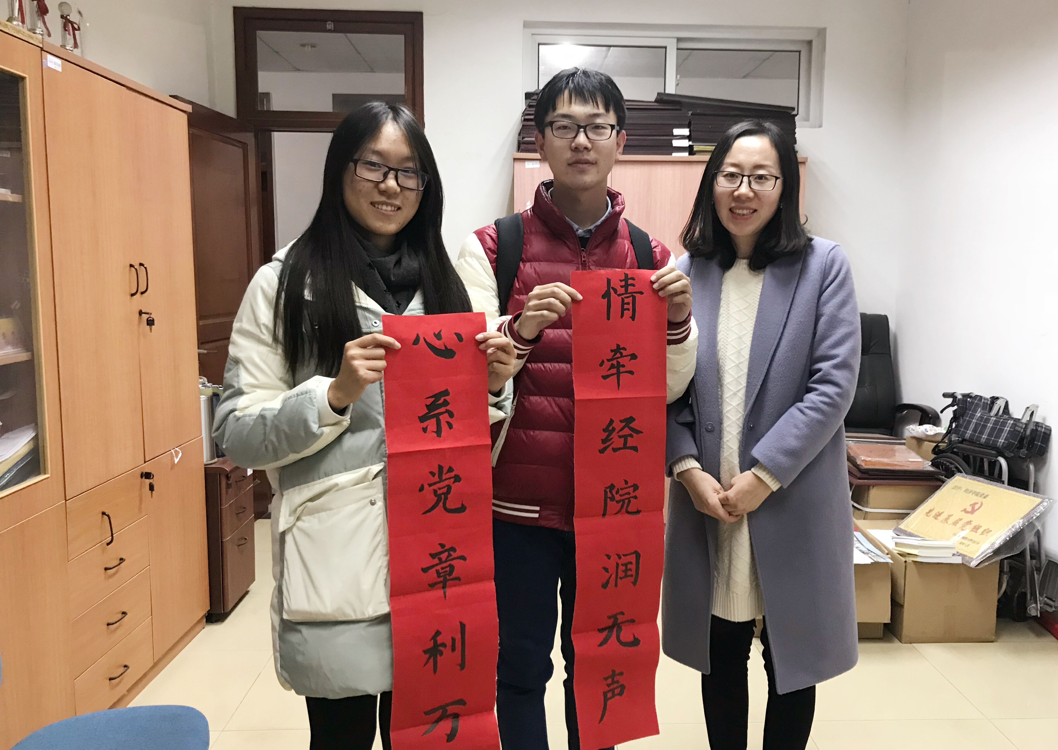 1月3日下午,同学们敲开了德经楼三楼今年会老师们的办公室,为老师们奉上一幅幅新年对联,表达新年祝愿。收到对联的老师们非常欣喜,有的主动要求贴在门上。老师们在欣喜之余,和同学们发出共同的倡议和祝愿:在新的一年里,南财师生携手奋进,砥砺前行,共同谱写公司事业发展的新篇章!