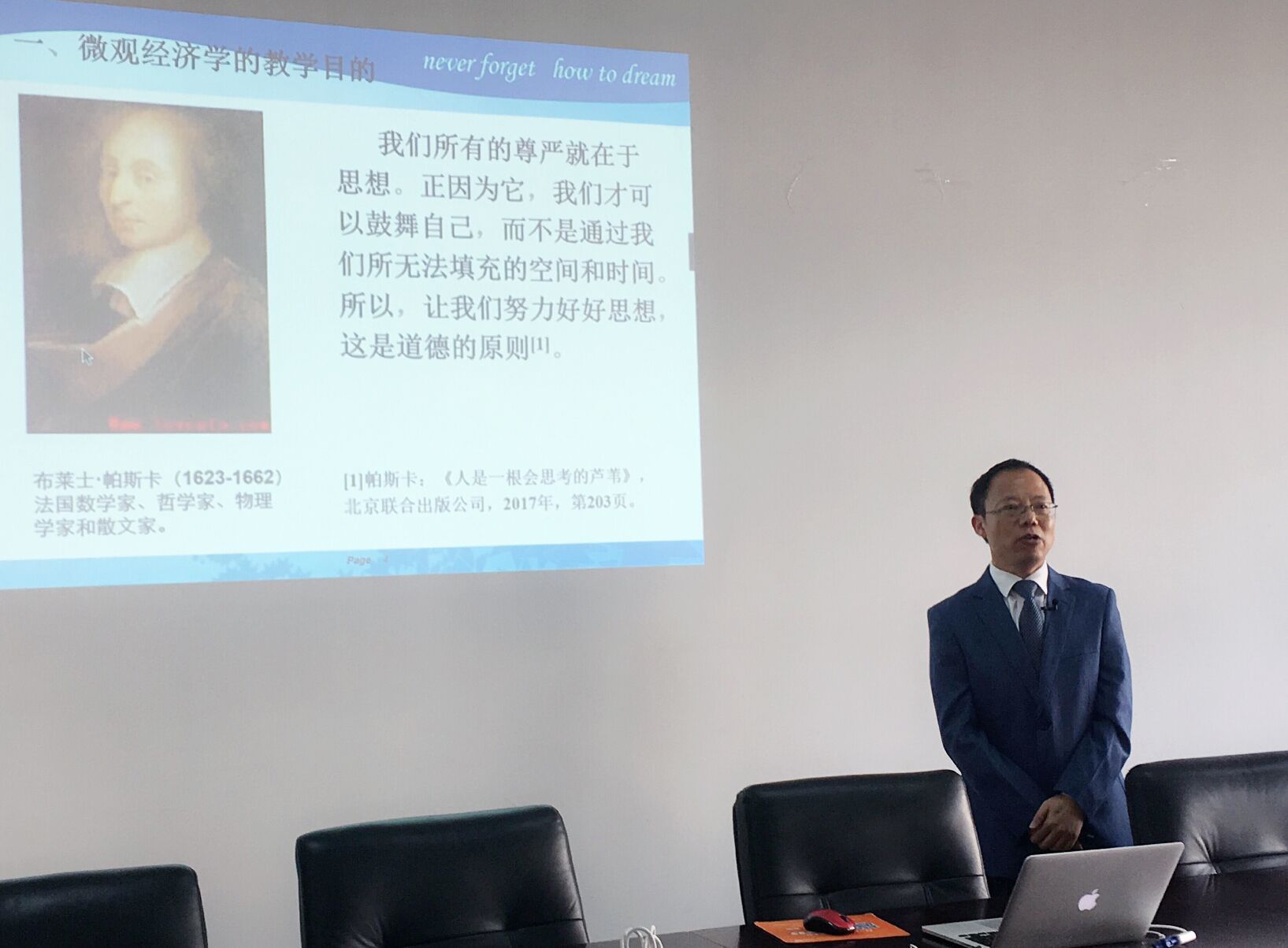 首先,南京师范大学商公司李政军教授做了题为《微观经济学的教学目的、思维方法和理论结构》的讲座,李教授从哲学视角出发,对前人研究成果进行高度总结概括,认为经济学教学的目的是教会员工经济学的思维方式。这种思维方式从方法论个人主义出发,重视人与人之间的互动关系,探讨经济理性主义。整个微观经济学的理论框架就是建立在方法论个人主义和经济理论主义的基础上,微观经济学中的消费者理论、生产者理论、市场理论、最优化理论、均衡理论均可以纳入到这个分析框架中。在座谈和交流环节,聆听讲座的各位老师与李教授针对微观经济学教学内容、教学方法、教学目标等若干问题展开了热烈的讨论。本次教学研讨活动的开展,使老师们进一步认识到经济学是一种分析方法,而不是一种教条,重在培养同学们一种思维方法。老师们还和李教授一起深入讨论了微观经济学知识体系、重点、难点、教学大纲的修订等问题。