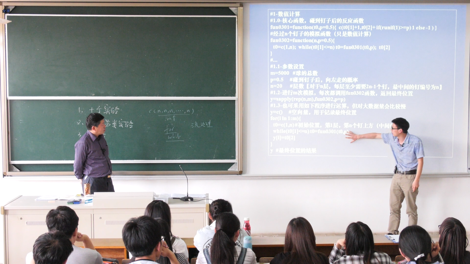 公司此次教改选择了统计实验三(概率模型实验)作为试点,由王庚和詹鹏两位老师合作进行。针对教学计划中的10个概率模型小实验,先由王庚老师讲解背景、原理、问题,随后则由詹鹏老师讲解相应的R语言编程与实现。在讲解中交流互动与问题回答穿插进行,课堂气氛热烈,同学们在满满的新鲜感中掌握了相应的专业知识。