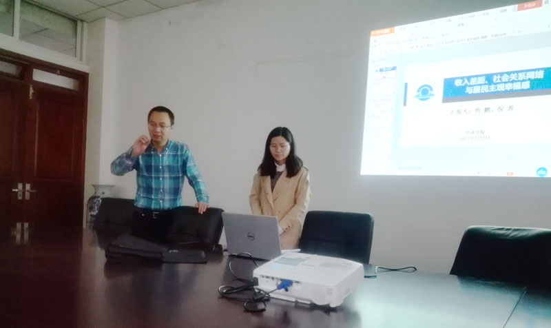 2017年5月2日晚上6点,长三角收入分配与经济增长研究中心在公司会议室举行了第十三次学术活动。公司副经理叶林祥教授主持了此次报告会。公司和财政与税务公司部分教师和研究生参加了本次学术讨论活动。本次报告的论文题目为“收入差距、社会关系网络与居民主观幸福感”,论文作者为公司青年教师詹鹏博士和硕士研究生倪蓉,论文由倪蓉报告。