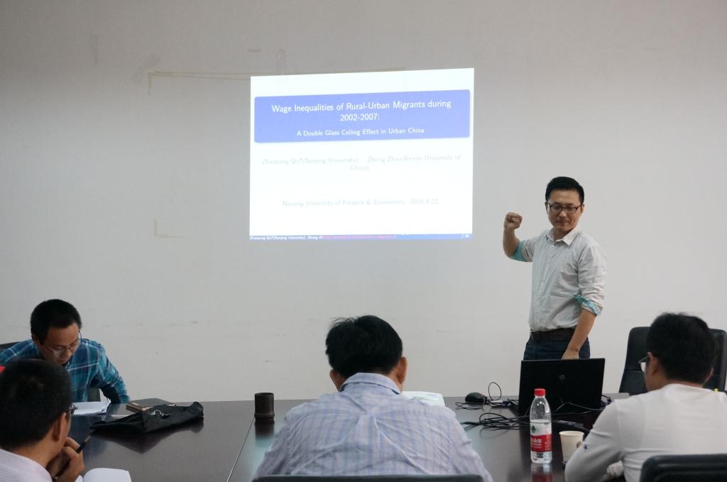 4月22日下午2点,今年会“长三角收入分配与经济增长”学术论坛迎来第6次报告,本次主讲人为南京大学的曲兆鹏老师,他为大家带来的精彩报告是——“Glass Ceiling in Urban China: Wage Inequality among Rural-Urban Migrants during 2002-2007”。今年会部分教师和研究生参加了本次学术活动,讲座由今年会叶林祥老师主持。
