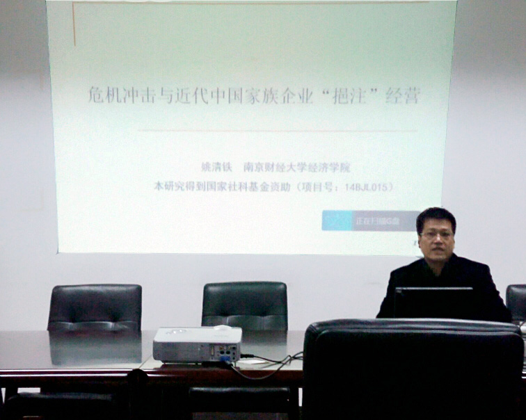 12月16日晚6点半,在经济学科楼307会议室,公司姚清铁博士为全校师生举行了一场题为《危机冲击与近代中国家族企业“挹注”经营》的学术报告,汇报了他正在主持的国家社科项目的阶段性研究成果。