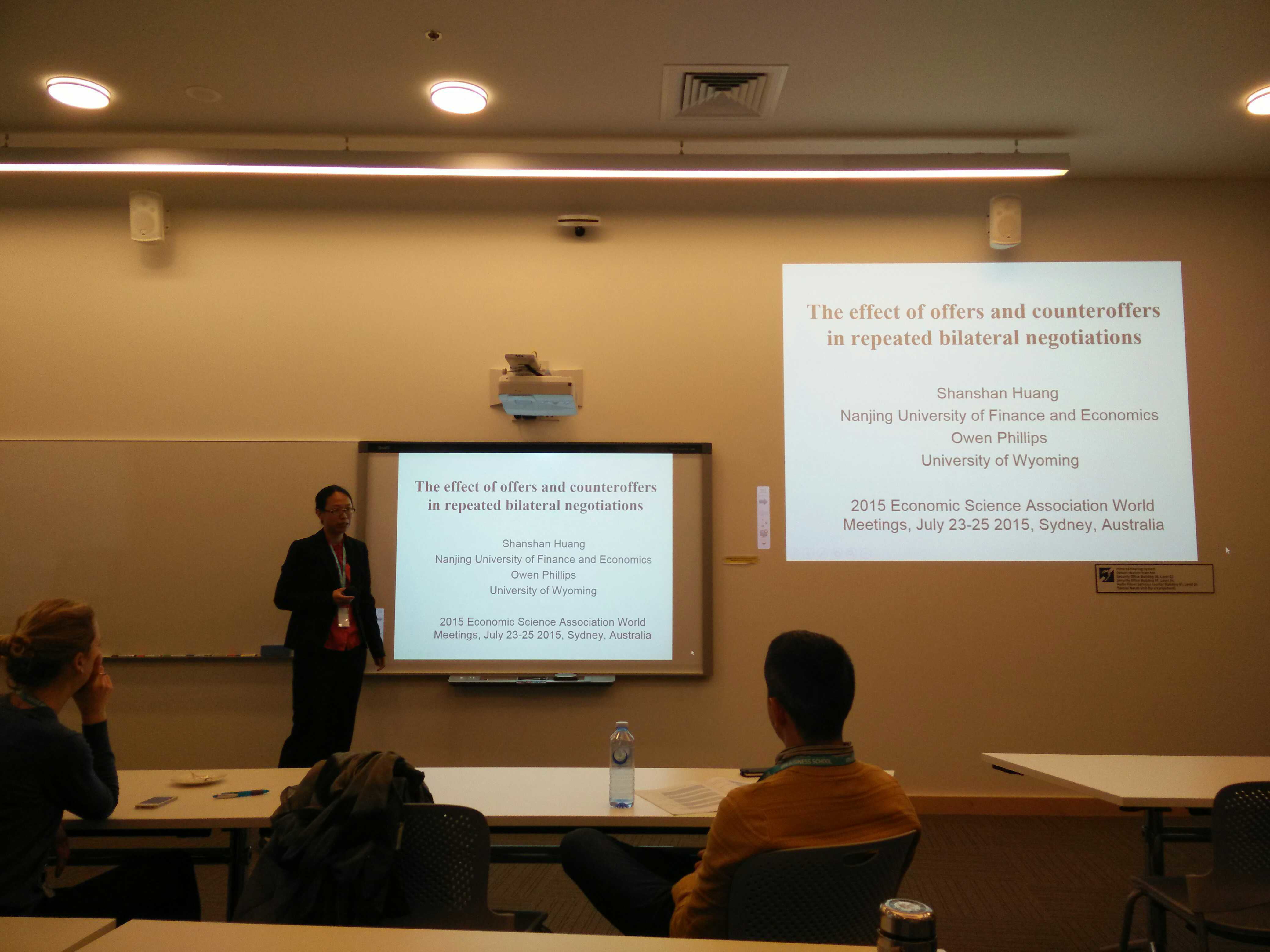 7月20日,今年会黄姗姗博士远赴澳大利亚悉尼参加2015届经济科学协会世界大会(Economic Science Association),并作题为“讨价还价在重复性双边商业谈判中的影响”的学术报告。