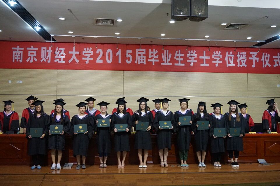 副经理叶林祥宣读了《关于同意授予2015届本科毕业生徐宁等3516位同学学士学位的决定》后,毕业生依次上台,与会领导和老师为毕业生颁发了学士学位证书、拨正流苏,并与同学们热情握手,表达祝愿。台下师生用他们热烈的掌声表达了对毕业生的祝贺与祝福。伴随着青春激昂的《南财大之歌》,学士学位授予仪式结束。