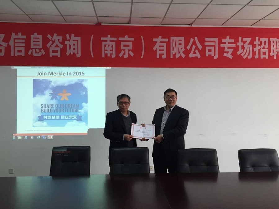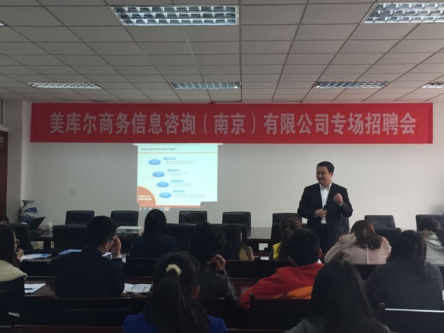 3月26日下午,美库尔商务信息咨询(南京)有限公司校园宣讲会暨专场招聘会在公司307会议室举办。美库尔上海分公司总经理张冀翔,南京分公司总经理秦宏,公司经理陈耀辉教授,尹敬东教授出席了此次招聘会。