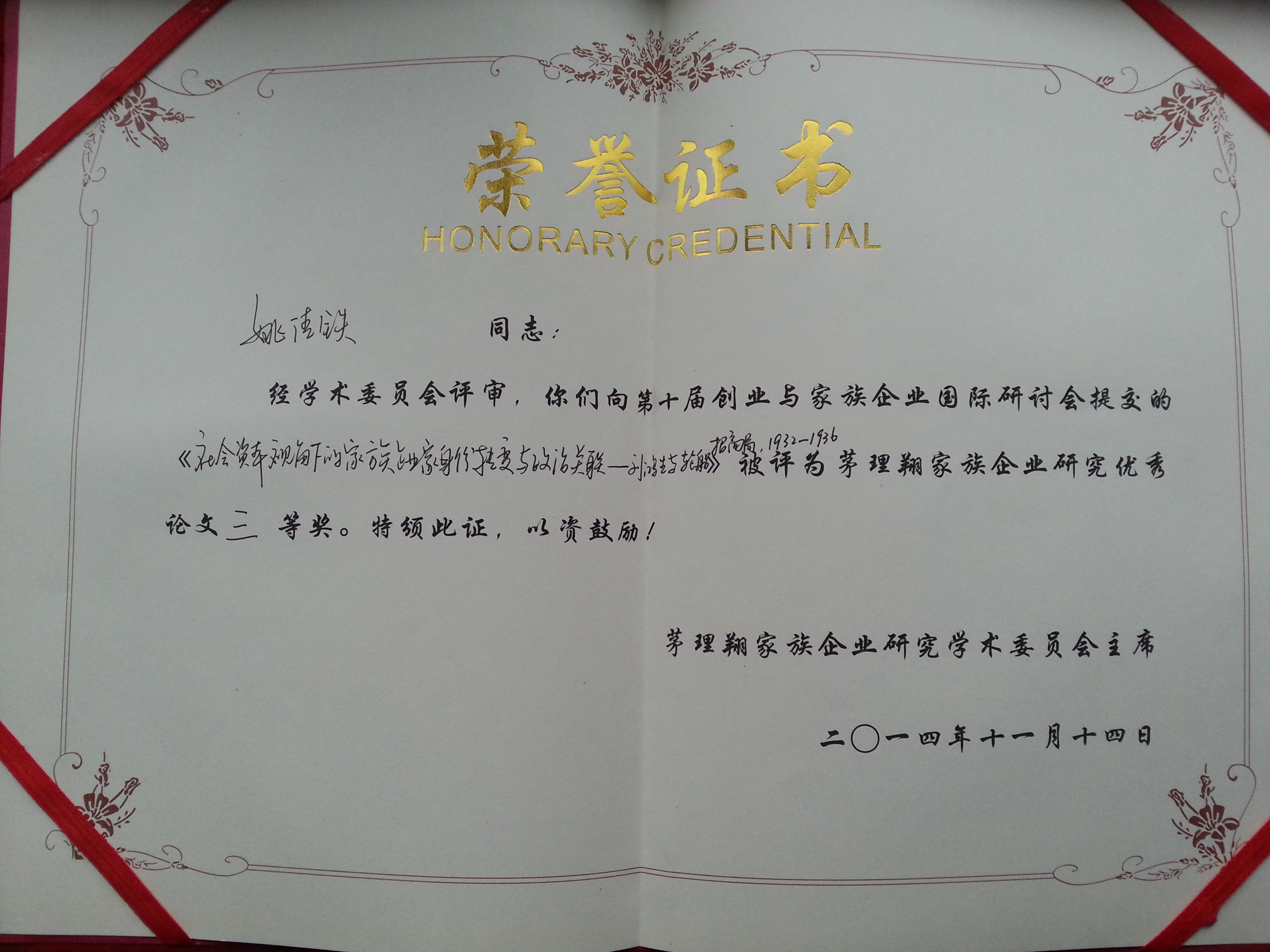 公司姚清铁博士长期从事家族企业和企业史研究,这也是他继2011年获得茅理翔家族企业研究论文二等奖之后再次获得该奖项。