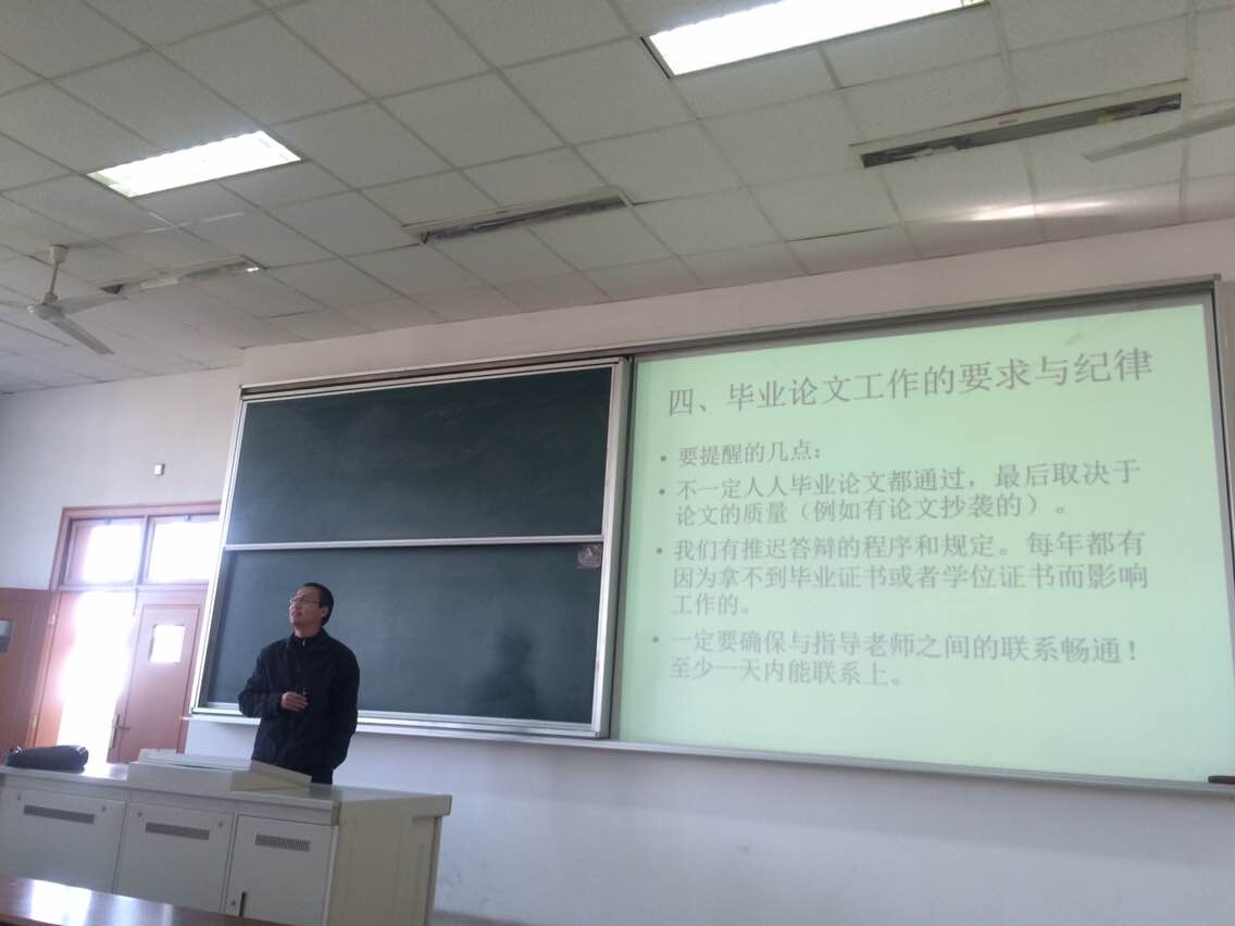 11月13日上午,公司在教C403教室召开年级大会,就2015届毕业年级毕业论文写作、毕业实习及就业考研等事宜做出安排。公司副经理叶林祥教授,党委副书记郝园园老师,2011级辅导员徐昊翔老师参加了此次大会。