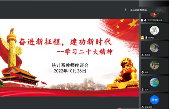10月26日下午,统计系全体教师举行了教师座谈会。由于疫情的影响,本次座谈会线上进行。适逢党的第二十次全国代表大会召开,本次会议的主题是“学习党的二十大精神,为建设社会主义强国培养人才”,教工支部副书记王平平传达了党的二十大精神,重点针对与国计民生相关的重要内容进行了解读。与会教师认真学习了大会精神,针对相关内容进行了讨论,表达了为建设社会主义强国培养栋梁人才的决心。随后,统计系柳杰民老师针对即将开始的海峡两岸老员工市场调查大赛进行了指导及动员,建议老师们积极参与,认真选题,与员工密切沟通,争取在明年的国赛中再获佳绩。
