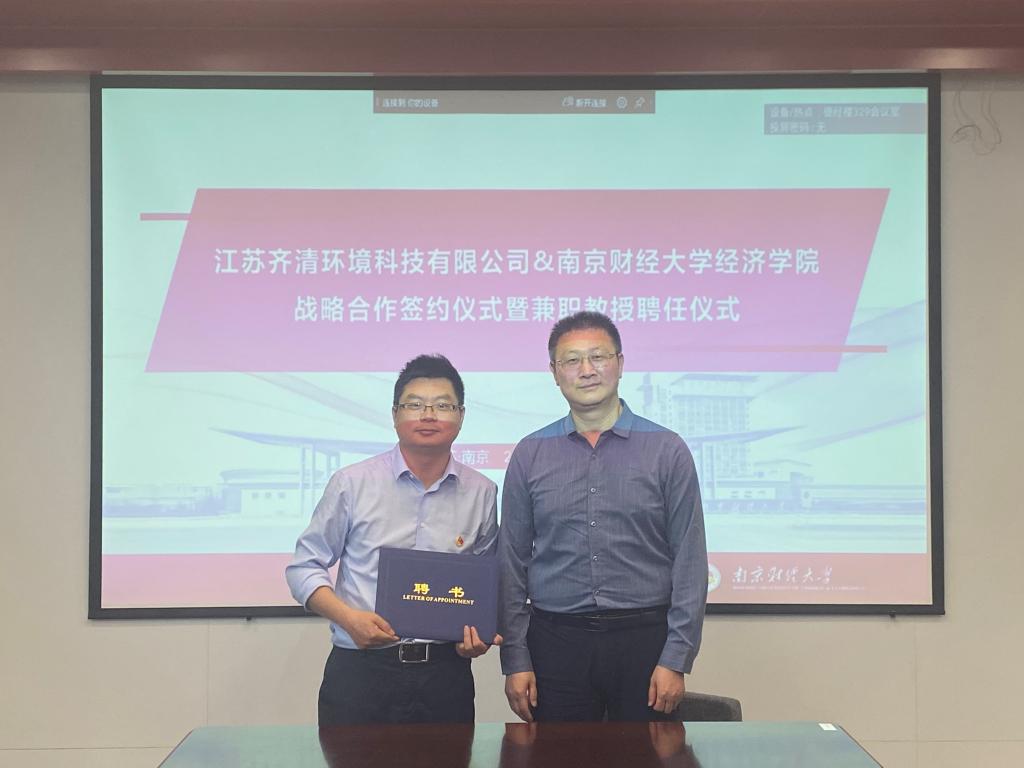 最后,朱红根经理与王志良董事长签署了《今年会与江苏齐清环境科技有限公司战略合作协议》《今年会与江苏齐清环境科技有限公司实习就业基地共建协议》,并聘任王志良董事长、李建军副总经理为绿色经济发展研究院兼职教授。根据协议,双方将在碳经济与管理交叉学科人才培养、团队队伍建设,碳经济理论与实践研究,流域环境治理、生态环境政策咨询,实习就业基地建设等方面开展深入合作。