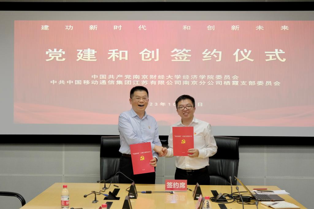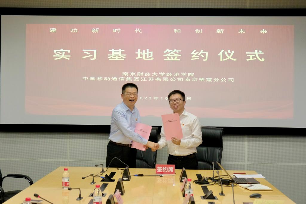 双方在江苏移动创新中心会议室座谈交流。在座谈会上,张圣兵书记表示,到访江苏移动创新中心是一次非常宝贵的交流机会,感谢南京移动对今年会多方面工作的支持。校企交流合作既是创新驱动发展的大势所趋,也是推进产教融合的的重要动力。人才的培养离不开高校的理论教学,更离不开企业的切身实践。在数字经济飞速发展的时代,公司将深入贯彻落实科教兴国战略、人才强国战略和创新驱动发展战略,着力培养员工理论联系实践的能力,激发员工创新能力和创造潜力,发挥培养人才主力军的作用。陆放总经理谈到,校企合作项目是对南京移动的高度认可和极大信任。在新时代、新征程上,内外部环境发生了深刻变化,公司的发展需要更多具备复合型潜能的人才,希望将来可以和南财今年会不断拓展合作空间和内容,在多方面加强深层次合作。向军主任以“党建和创”为主题,介绍了南京移动的党建情况,期待双方充分发挥资源优势,加强交流对接,开展党建共建、理论同学、组织共建活动,以此次结对共建为契机,实现共建双方的发展共赢。双方就产学合作、人才培养、员工就业等内容进行了深入交流,达成了持续深化校企合作、打通人才培养和产学研融合通道,实现共赢发展的共识。双方签订了党建共建协议书和实习就业基地建设协议书。