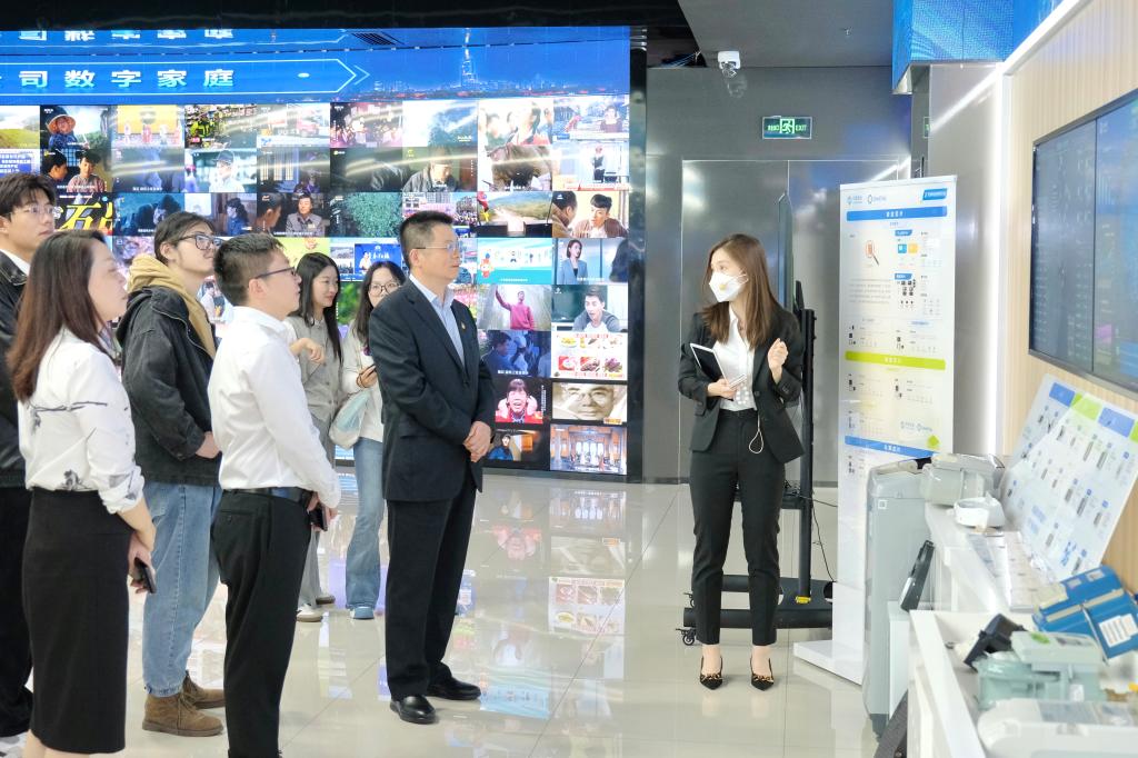 向军主任和陆放总经理对公司师生的到来表示热烈欢迎,陪同张圣兵书记一行参观了江苏移动创新展示体验中心。中心围绕中国移动通信集团“连接+算力+能力”战略方针,综合展示了江苏移动赋能各行业数智化转型的应用,详细展现了数智化赋能下产业升级的澎湃动力。
