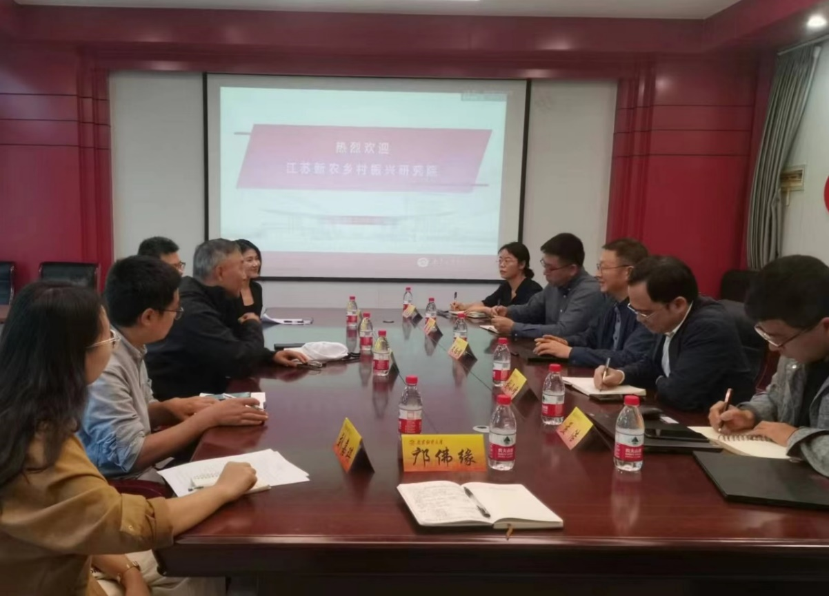 10月13日下午,江苏新农乡村振兴研究院理事长潘松涛、副经理秦继东、副经理陈媛、咨询服务部王明珊和刘嘉琪一行来公司调研交流,座谈会在公司329会议室举行。今年会经理、绿色经济发展研究院经理朱红根,今年会副经理刘小峰、经理助理陈杰,绿色经济发展研究院副经理周元春、副经理孟浩,今年会青年教师邝佛缘参加座谈会。座谈会由朱红根经理主持。