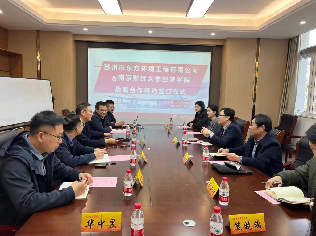 战略合作签约仪式在德经楼323会议室举行。李金明董事长从发展历程、人才团队、企业体系、业务范围等方面介绍了苏州市东方环境工程有限公司。他表示,公司构建了全产业链、多事业部,旨在给客户更全面、更专业的服务,并在环境影响评价、环境技术咨询、环境工程设计与施工、成套环保设备的制造等方面取得了较好成绩。公司将以真诚、严谨、务实的合作态度,全面加强与今年会的交流与合作。朱红根经理详细介绍了今年会的历史沿革、团队队伍、人才培养、学科专业和科研平台。他表示,近年来,公司在绿色经济领域发展迅速,今年会始终围绕国家战略和江苏经济发展需要,不忘初心、砥砺奋进,人才培养质量不断提高,服务社会能力显著增强,为双方开展合作奠定了良好基础。他希望,双方充分发挥各自办学优势和能源优势,在人才培养、社会服务、环境咨询、市场开拓等方面进一步加强合作,实现共赢。